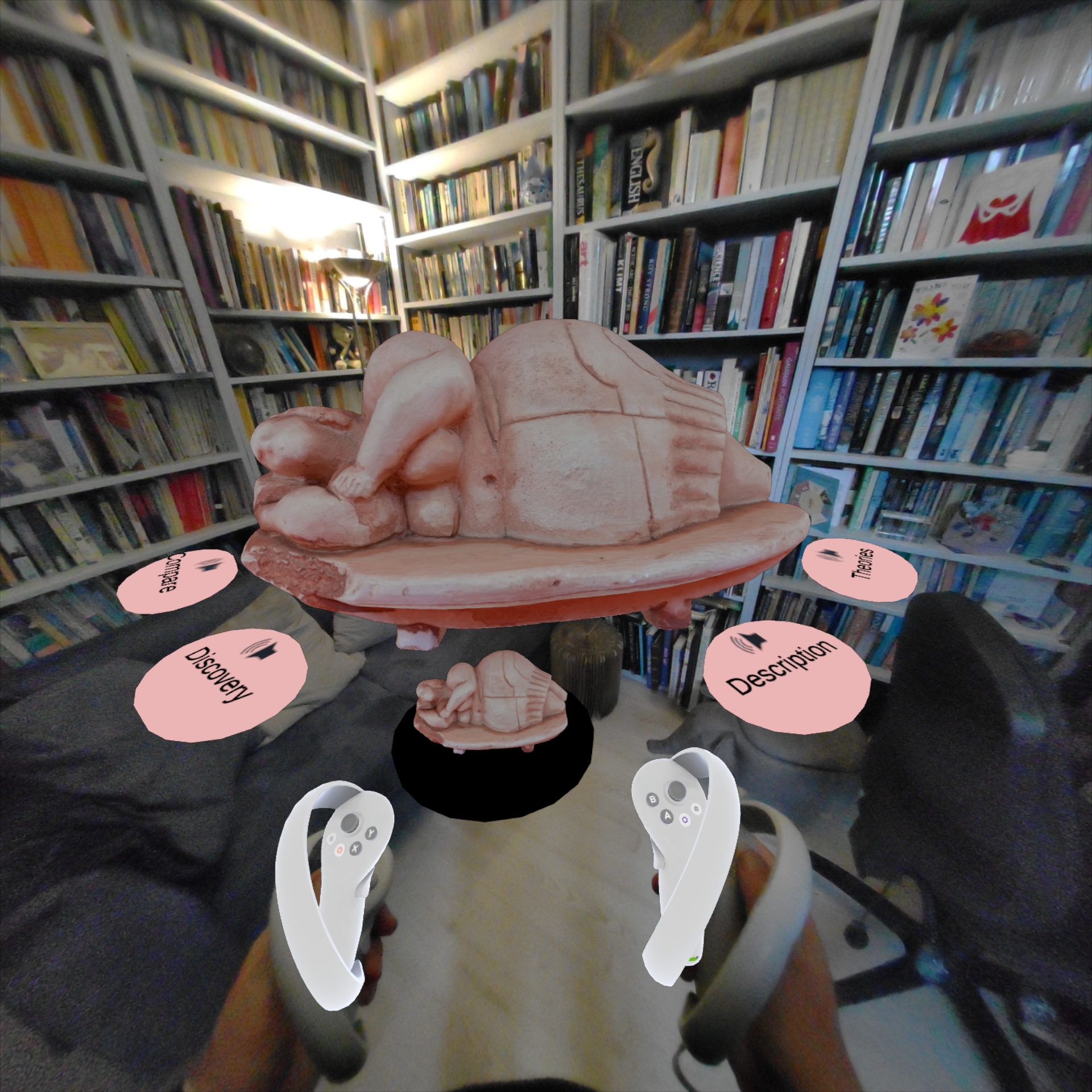 Next I intend to create a clone of the current 'Sleeping Lady of Malta' demo and replace the item looked at with another, probably one local to my area, say the 'Colchester Roman Vase'. This would demonstrate that the display method works for other, similarly sized items. An expansion of functionality would be to allow selection from one of a dozen or so items on one theme or from one locality. A further expansion would be to make the app multiplayer, say up to 4 players, to allow a group (both co-located and remote) to view the same object and discuss it.
