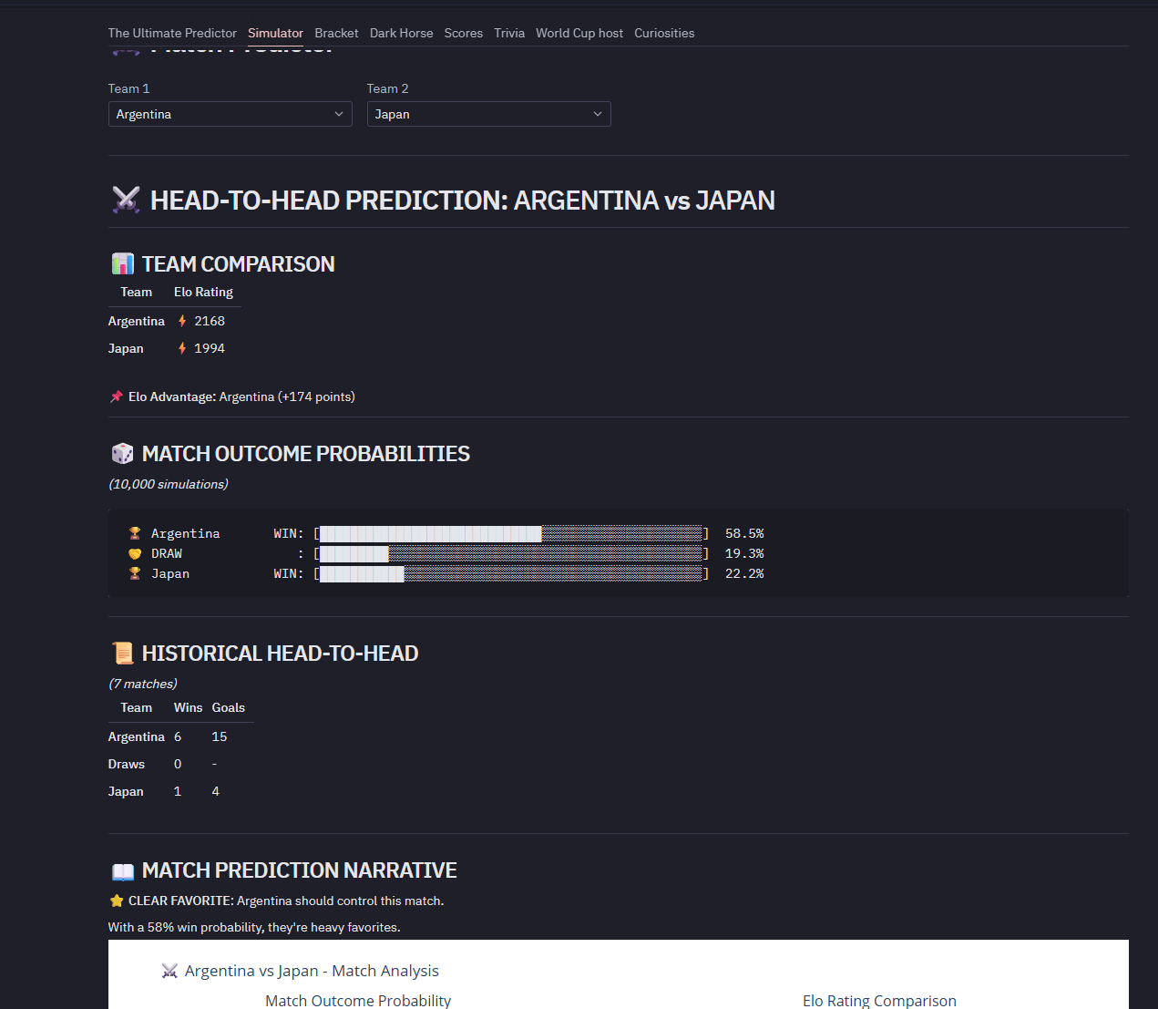 - 📊 Visual Analytics: Elo evolution, goal timelines, dark horse analysis, and Golden Boot predictions