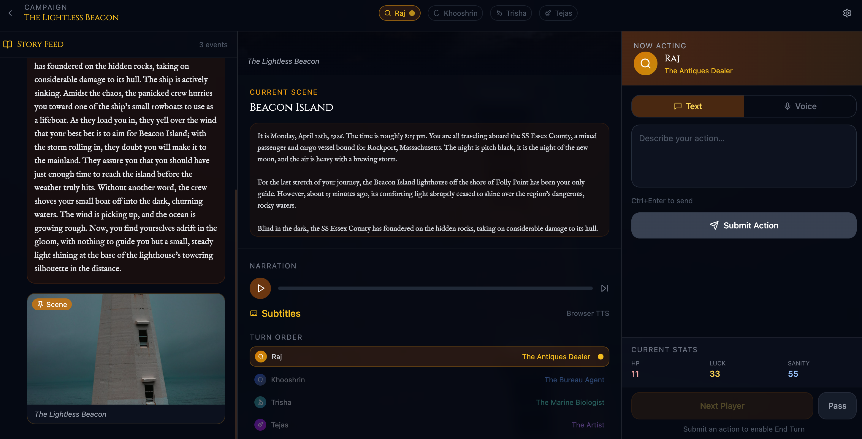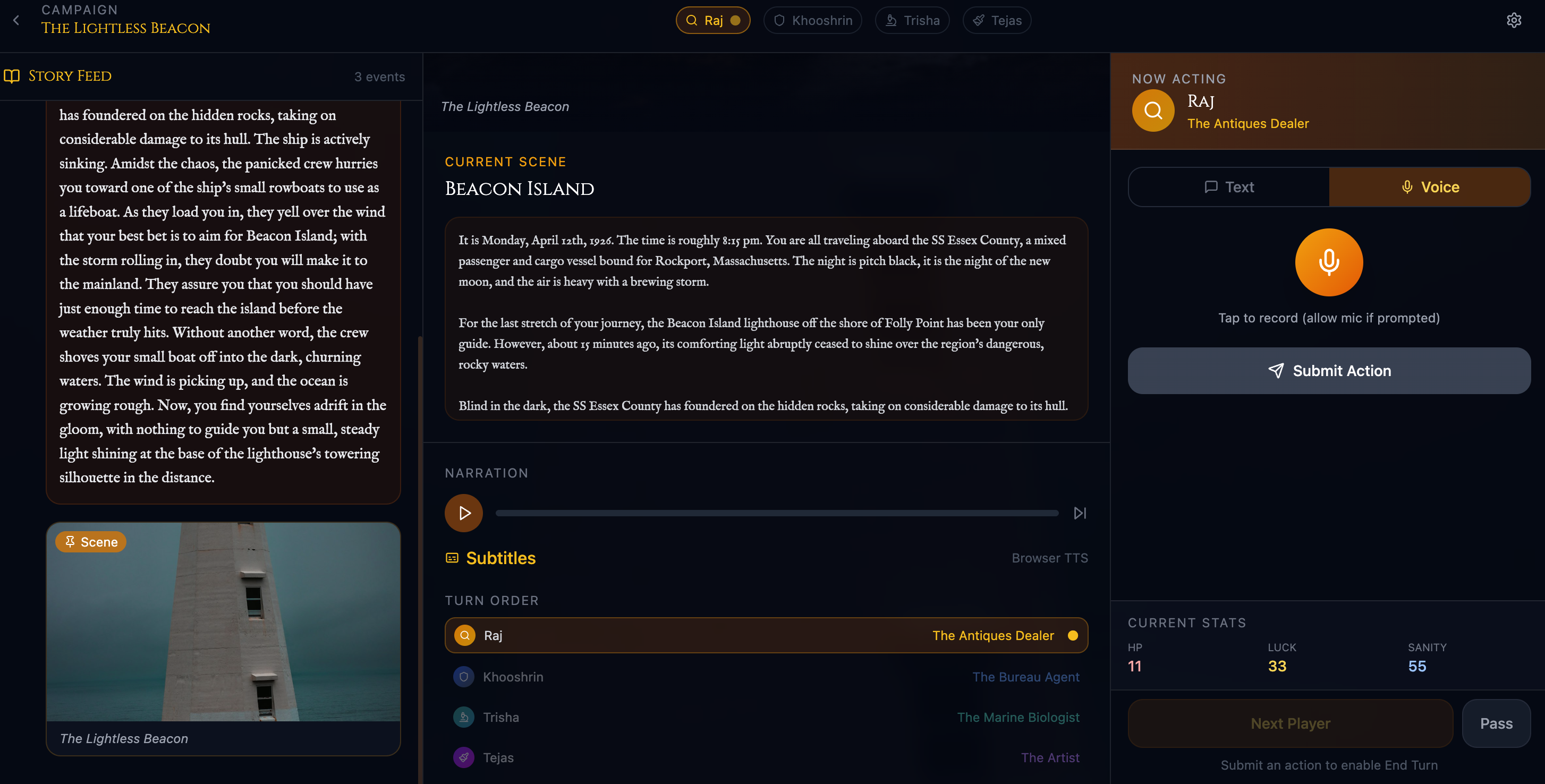 Call of Cthulhu: The Unseen Narrator is our step toward that vision: a structured, community-informed, voice-ready AI Keeper built for immersion, consequence, and entertainment.