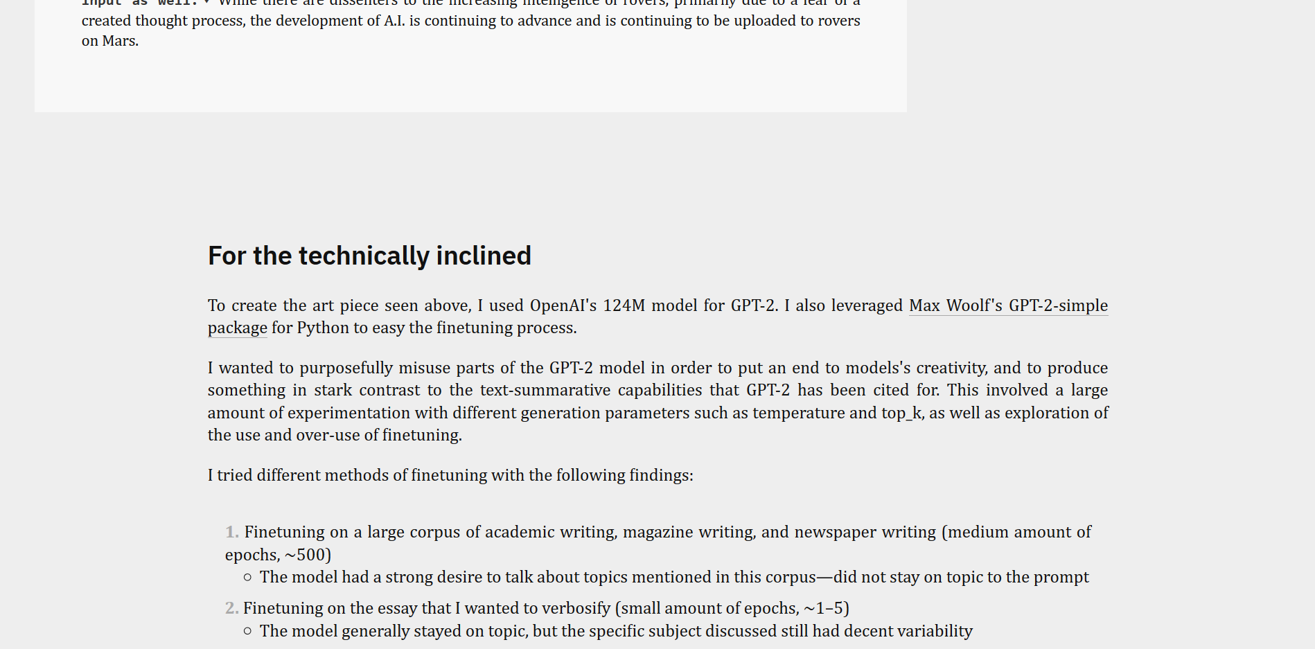 To create the verbosified essay, I utilized OpenAI's pre-trained 124M GPT-2 model, and finetuned it on passages from my essay using Max Woolf's gpt-2-simple package for Python. I then generated samples from the model and hand picked my favorite outputs.