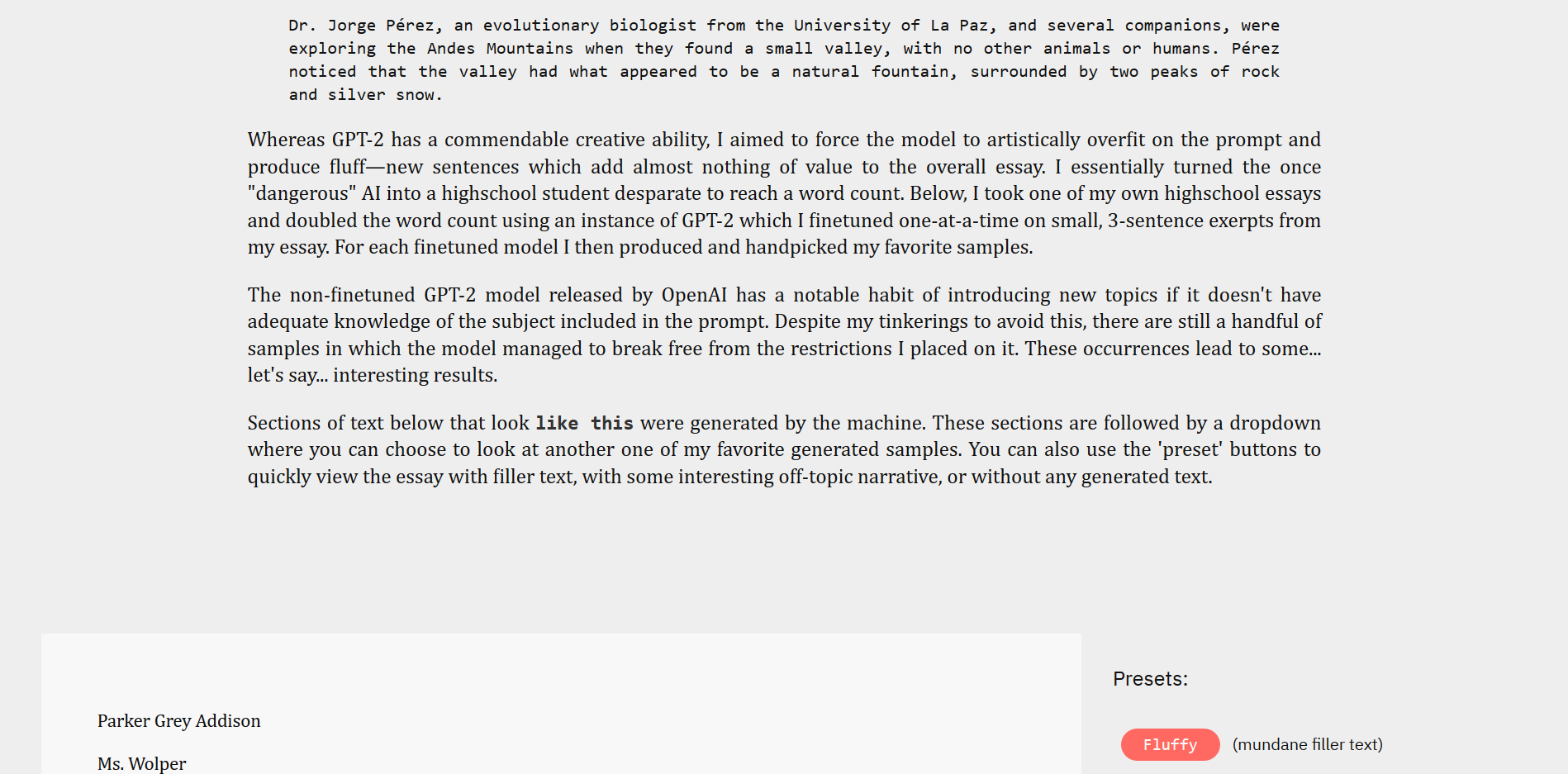 To highlight this art project I designed a snazzy interactive webpage for people to explore some of the machine generated text. This webpage gives users the opportunity to read the essay with and without the generated text, and lets them change generated passages of the text in real time—allowing users to uncover the expected and unexpected behavior of GPT-2.