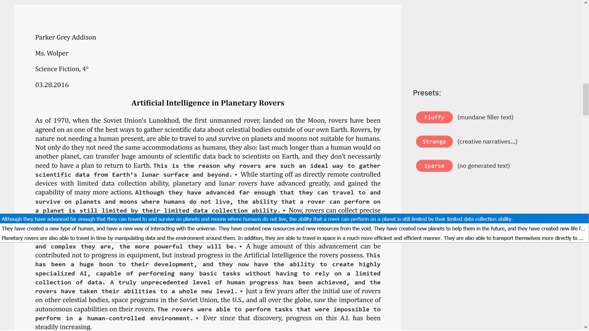 I then fed in an essay that I wrote in high school, and let the model (I call it the verbosifier) get to work and generate a handful of fluff text between almost every original sentence in the essay.