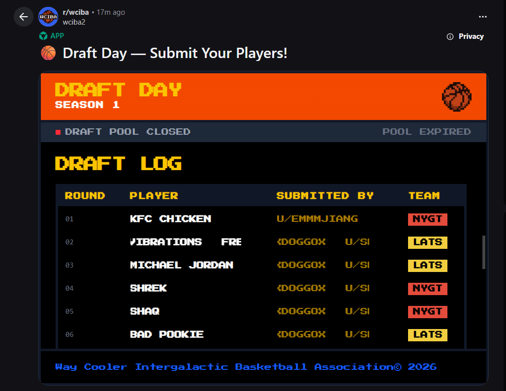 On top of that, working with Devvit was tricky since many features were still in beta. Designing a simulation that felt believable as basketball while still leaving room for unpredictable “chaos” also required significant iteration and balancing.