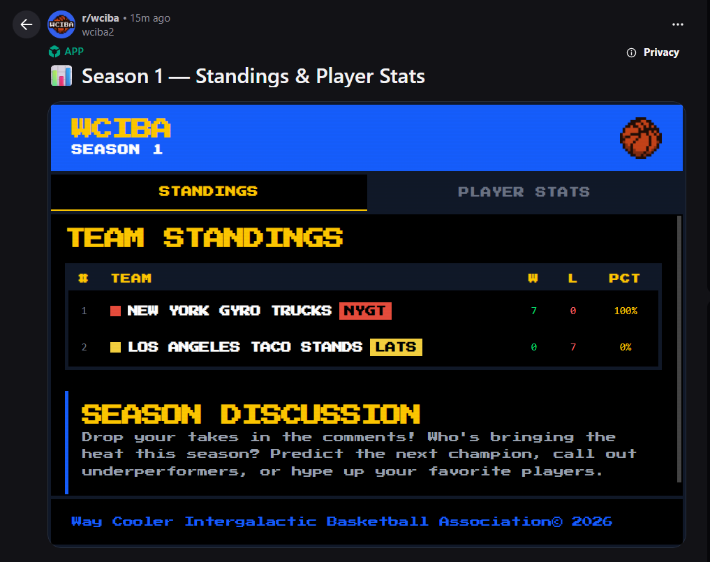 WCIBA started as a mashup of things we love: the strange, high-stakes storytelling of Blaseball, the dramatic “save the world through sports” energy of Space Jam, and the unpredictable chaos of Reddit communities.