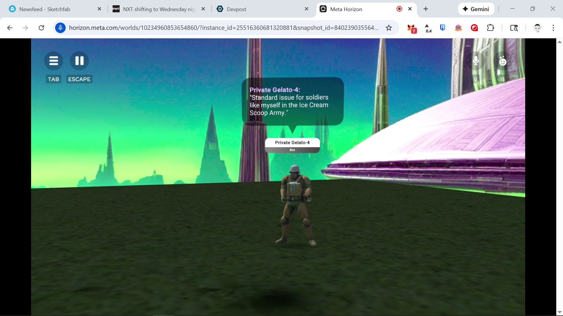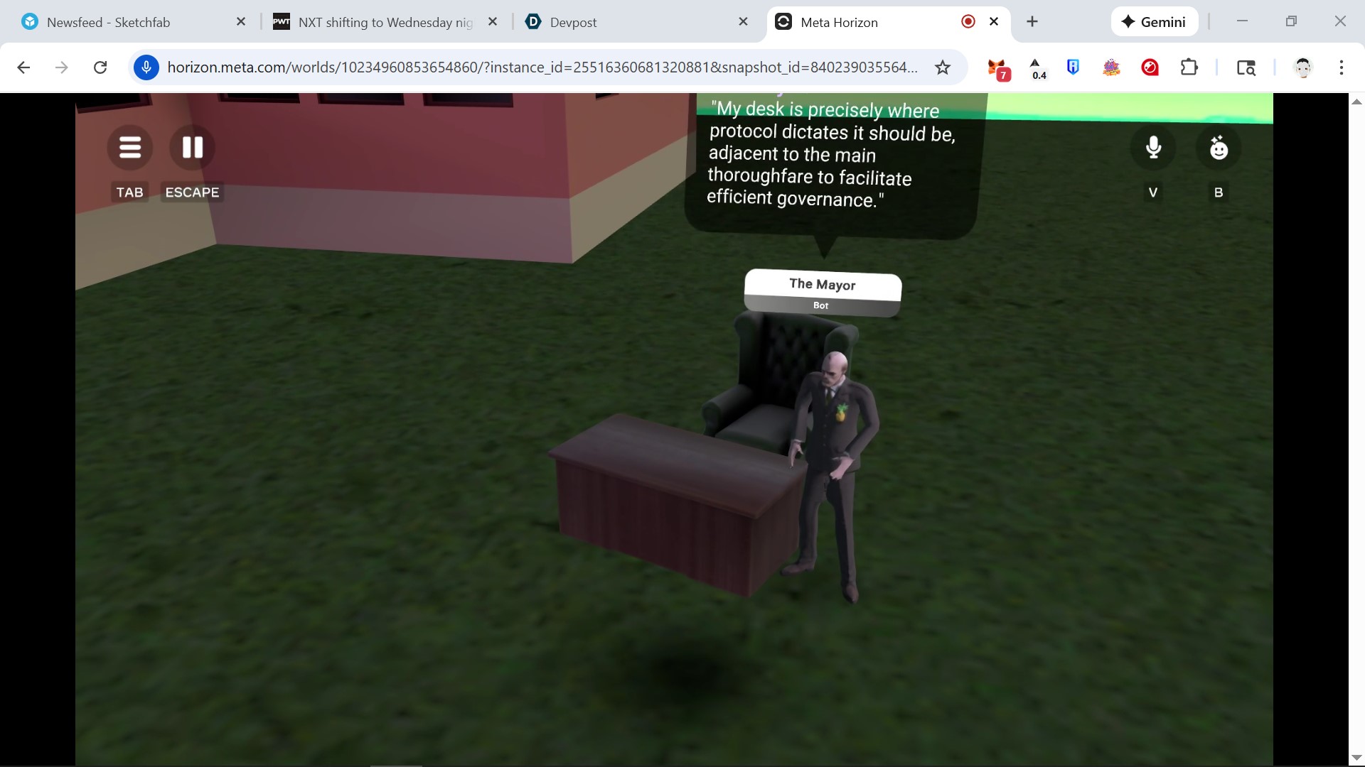I have very limited typescript and coding skills in general. I was able to use a multitude of ai platforms to get the script I was finally happy enough with to make this scene work. I built a couple of the buildings in blender and used public assets for much of the props on scene. I used gen ai for the characters, the sky dome and for the Pencil model.