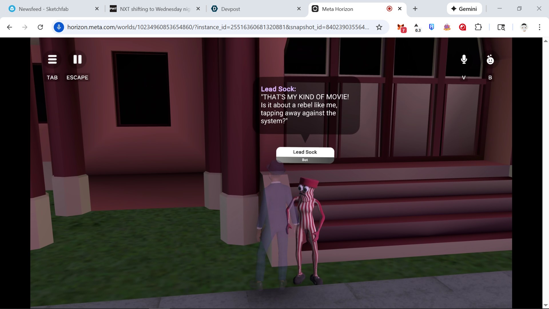 AI NPCs act as the characters from Tap Dance to give the player an understanding of the story through having conversations with the player. NPCs start listening when a player enters the trigger zone and respond after player speaks and stops for an adjustable amount of time. Each NPC is accompanied by a prop or setting that references their part of the story.