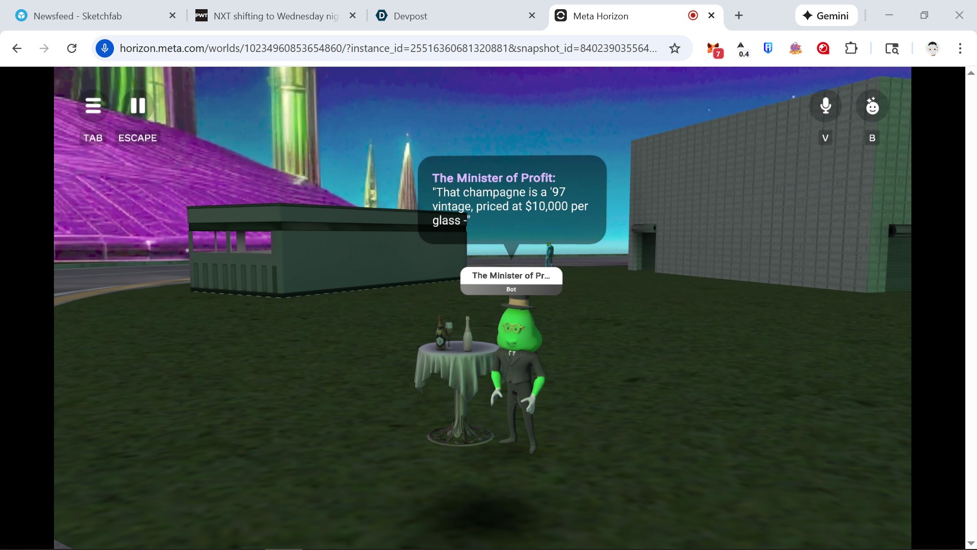 The Minister of Profit standing by a table with champagne