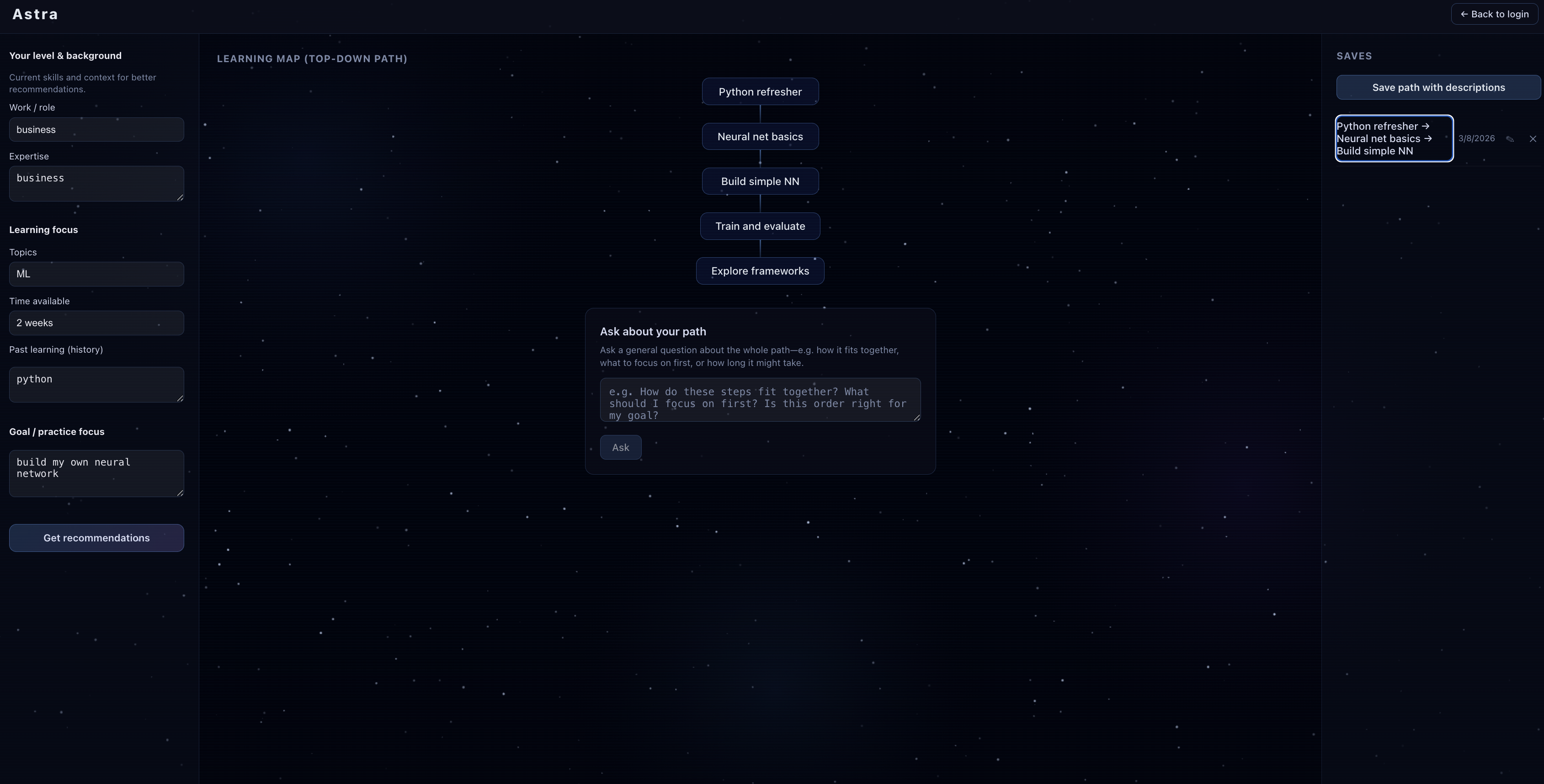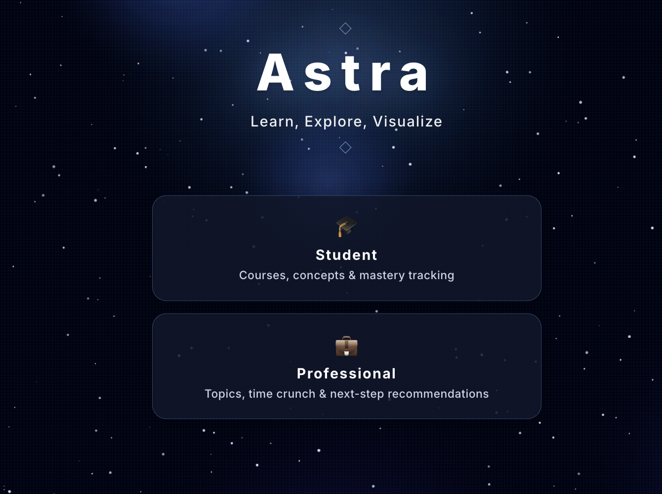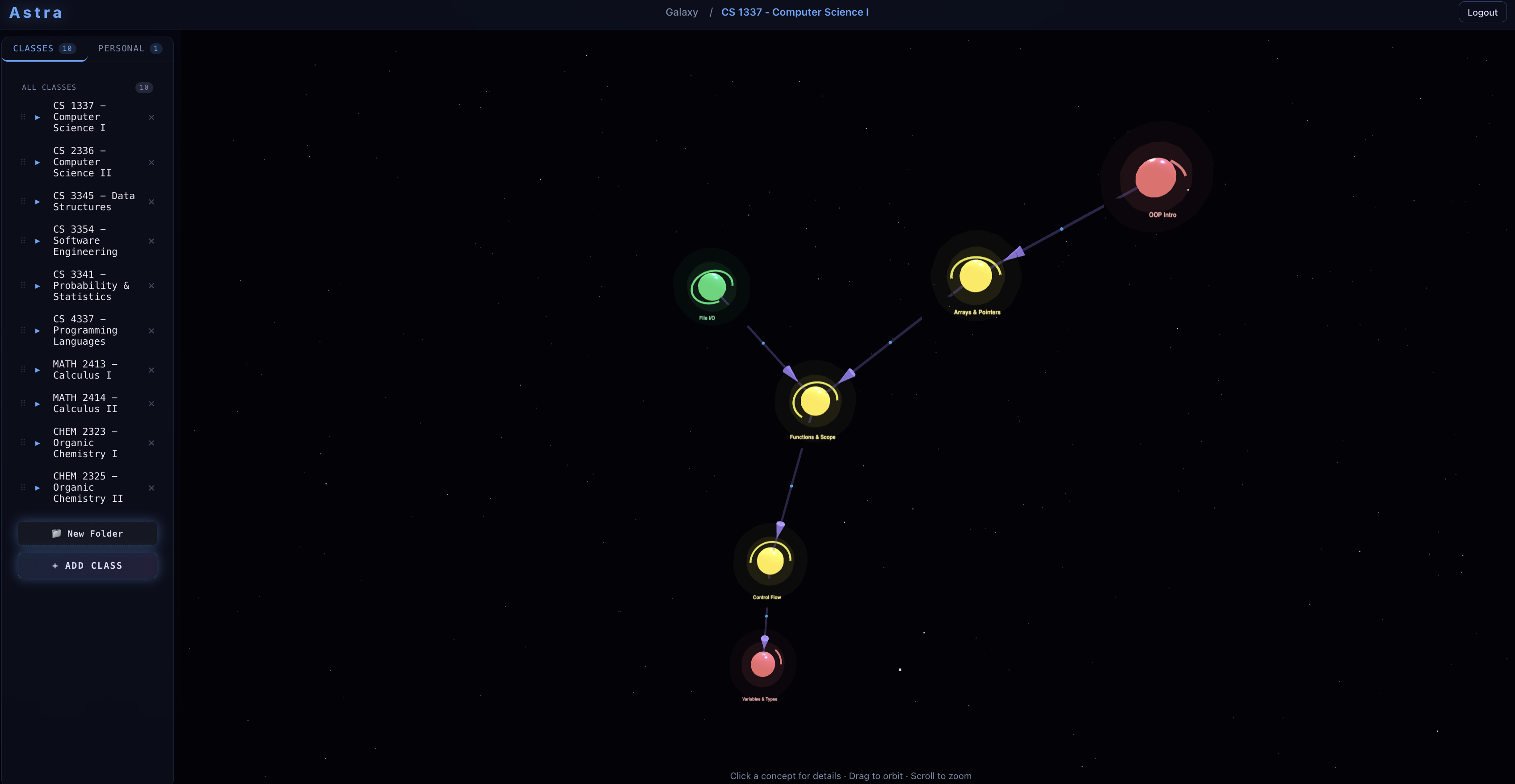 Every UTD student knows the pain: CourseBook is static, grades feel unpredictable, scheduling conflicts hide, and no tool shows how mastering one concept actually affects the next. NotebookLM style PDF chatbots and generic recommenders don't help with real campus decisions. I wanted to build something alive that learns with you, uses UTD's own data, and visualizes your progress in an immersive 3D universe. Astra turns your degree plan into a living galaxy where mastery ripples like gravity.