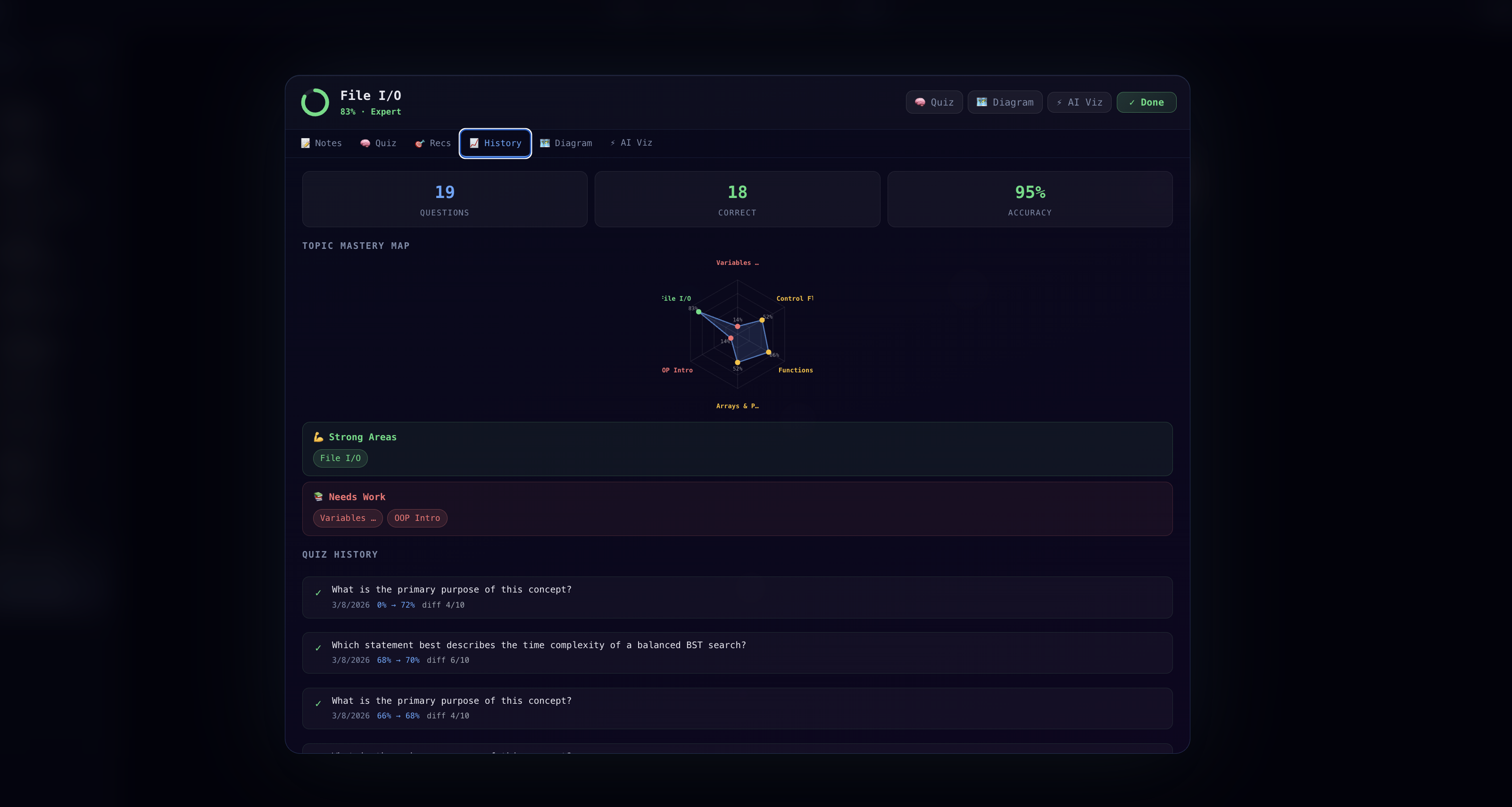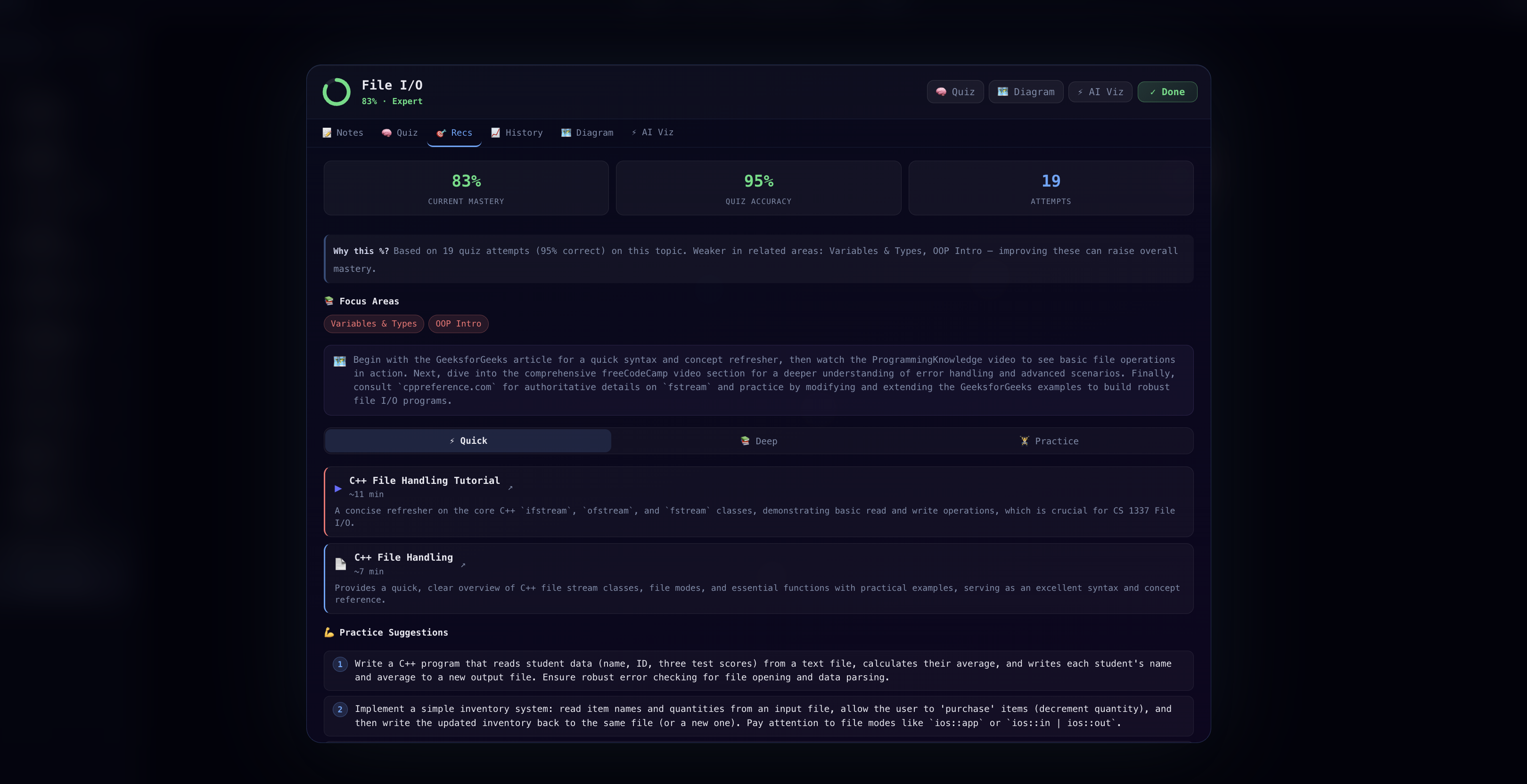 - Generates adaptive quizzes, diagrams, and mini-games with tone anchored to your current mastery (supportive when struggling, challenging when advanced)