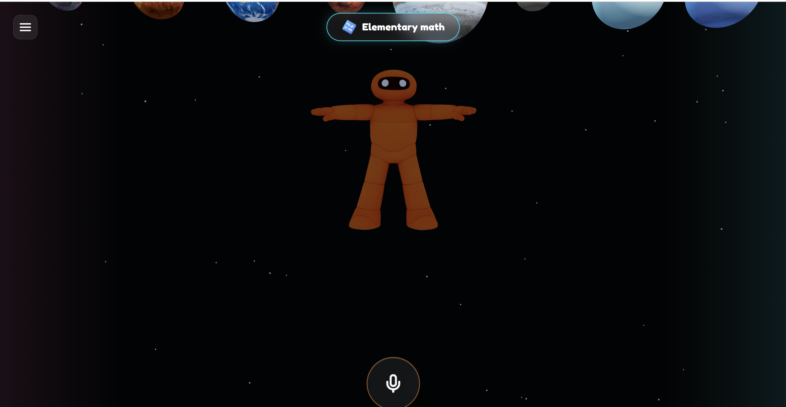 Ask it to explain multiplication and it doesn't send you a paragraph. It spawns glowing groups of cubes, points at each one, counts them out, and merges them together to show you the answer. Its hands move toward the objects as it explains them. The character and the math are one unified experience.