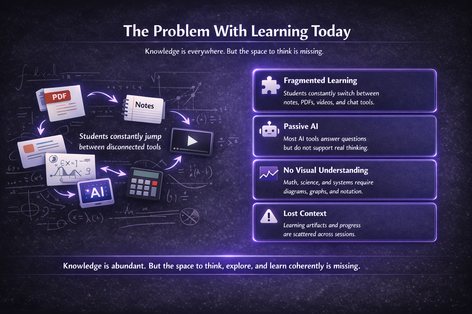 Yet the tools we use to learn have barely evolved. Students still jump between slides, notes, videos, and AI chat windows scattered across different tabs. Knowledge is everywhere, but the process of thinking through ideas remains fragmented. Most tools deliver information, but they rarely support how people actually think, explore, and develop understanding.