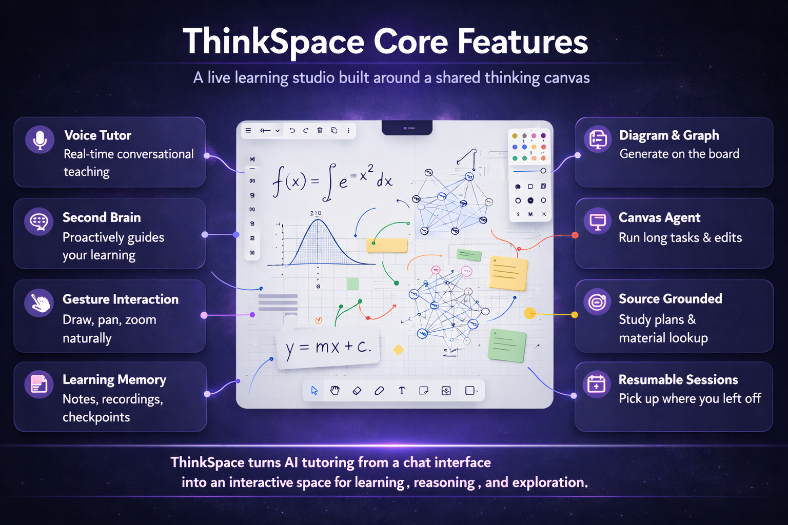 ThinkSpace is a live AI learning studio built around a shared thinking canvas.
