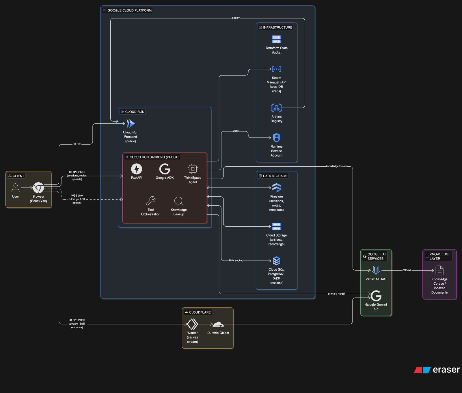 We also treated infrastructure as code as part of the build, not an afterthought. ThinkSpace uses Terraform-managed cloud infrastructure for core services such as storage, databases, secrets, and runtime deployment, which made the system easier to provision, iterate on, and deploy reliably during the project.