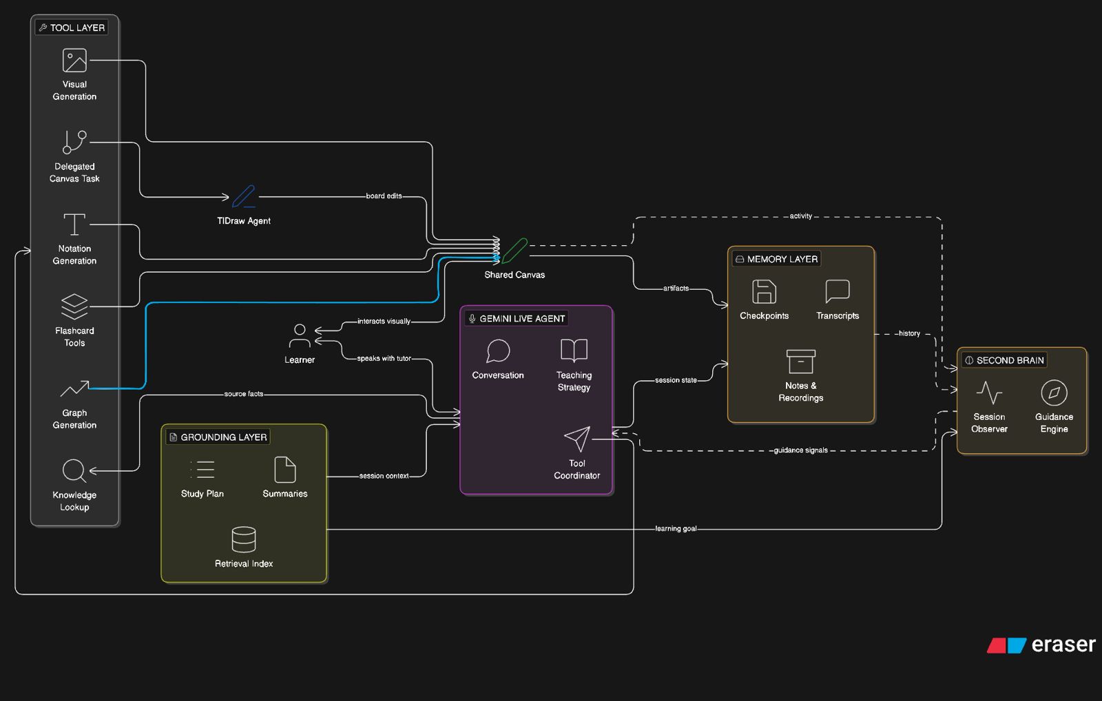 ThinkSpace is designed as a real-time multimodal learning system where the tutor understands both the live conversation and the visual state of the canvas.