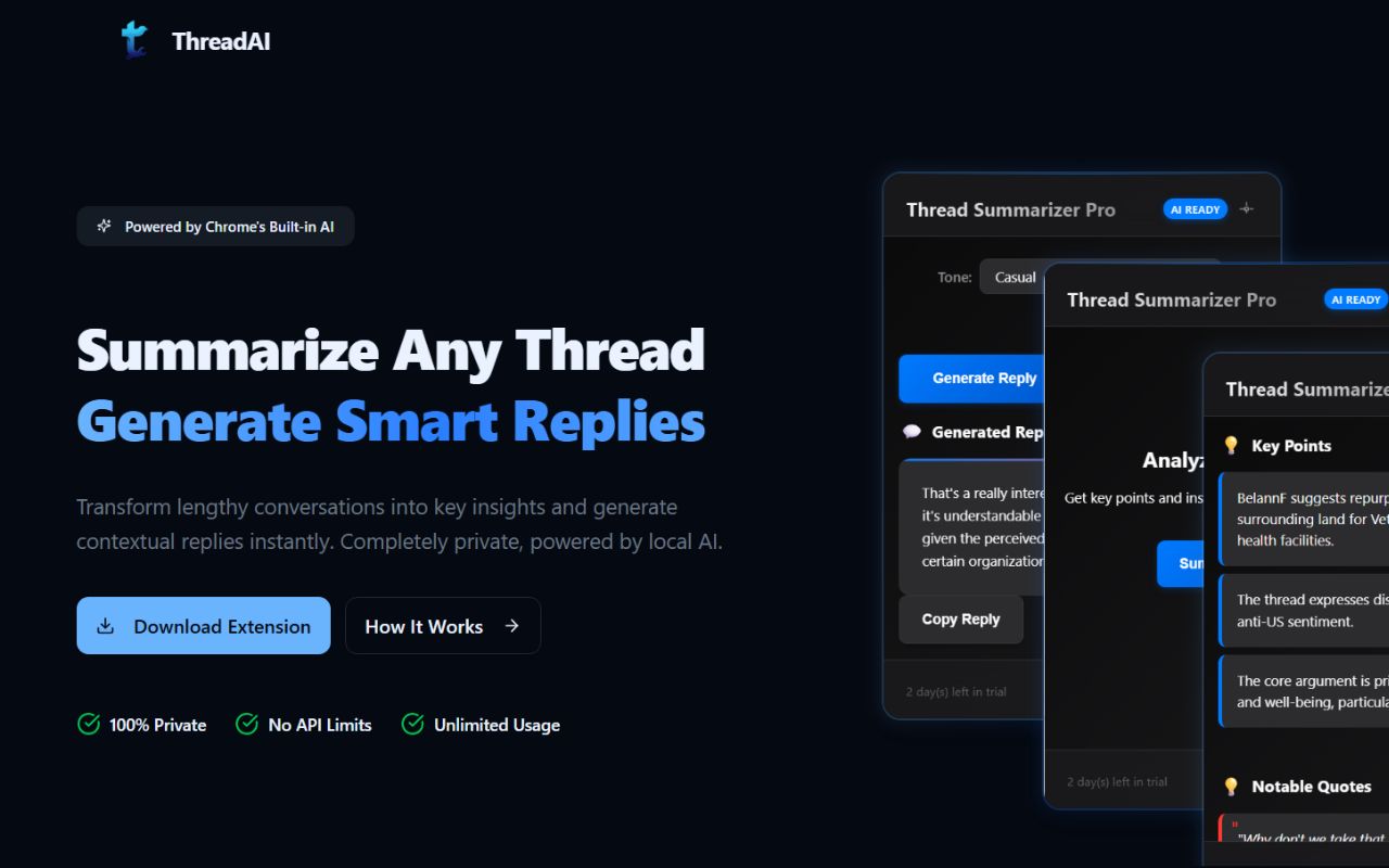 Scrolling through long social threads is something I do a lot, but it often feels like a time sink. You have to read dozens of replies just to get the main idea, and then come up with something thoughtful to add. That’s what inspired ThreadAI, I wanted a simple way to understand the essence of any thread and respond intelligently, without spending minutes (or hours) reading everything.
