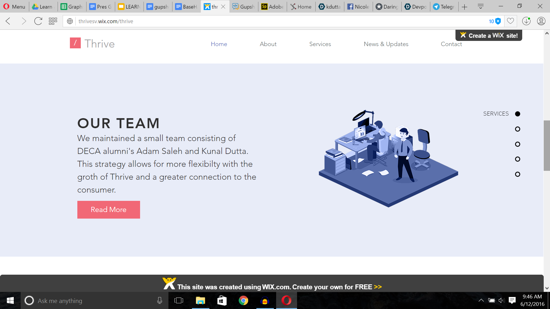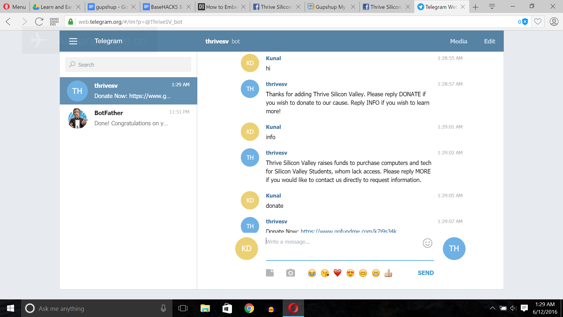 From January to March 2016, Thrive Silicon Valley raised over $600 to benefit underprivileged youth in the Silicon Valley, and over half of those funds resulted from donors. We spent $30 in material and advertising expenses and the approximately $570 profit to donate to charity was a boost to our morale and a motivator to carry the campaign on a deeper level. We wanted to capitalize on the generosity of our supporters and popularity of the campaign and create an interactive website to streamline communication, so we do not have to spend excess time and energy meeting supporters face-to-face. Through Beerud Sheth, we learned how GupShup could assist businesses in communication, and that application directly benefited our case and solved some of our problems. Using a bot, we could reach 100% of people requesting information, which would be impossible for us prior to the development. In addition, we could raise access to people living outside our community by moving past our sole use of a crowdfunding page into a large website in which we could be contacted and sponsored, which would both increase our revenue and increase the user experience, as there is less risk of overlook and increased communication factors. Overall, the combination of website development and a dedicated chat bot was found by us to be an ideal combination to address our needs and increase our profit margin.