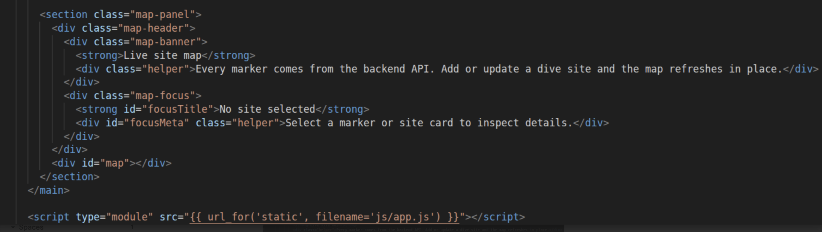 We built TIDE as a web app with a Flask backend and a frontend using HTML, CSS, and JavaScript. The app shows dive sites on an interactive map, lets users sign in with Google, and allows authenticated users to add or update site information. We also added a SQLite database so dive site data is stored permanently instead of disappearing every time the server restarts.