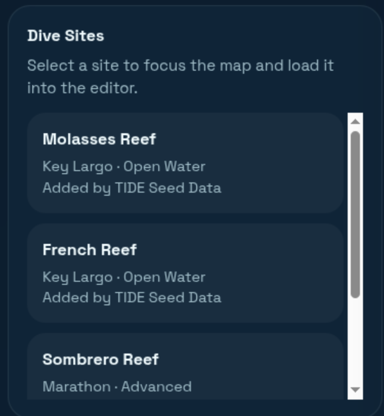 TIDE is a coordination platform for marine survey teams and volunteer divers. It provides a map-based interface that shows reef zones, survey activity in the past, and planned dives coming up. This encourages users to see which reefs have not been surveyed yet and join upcoming dives to avoid duplicate efforts between organizations.