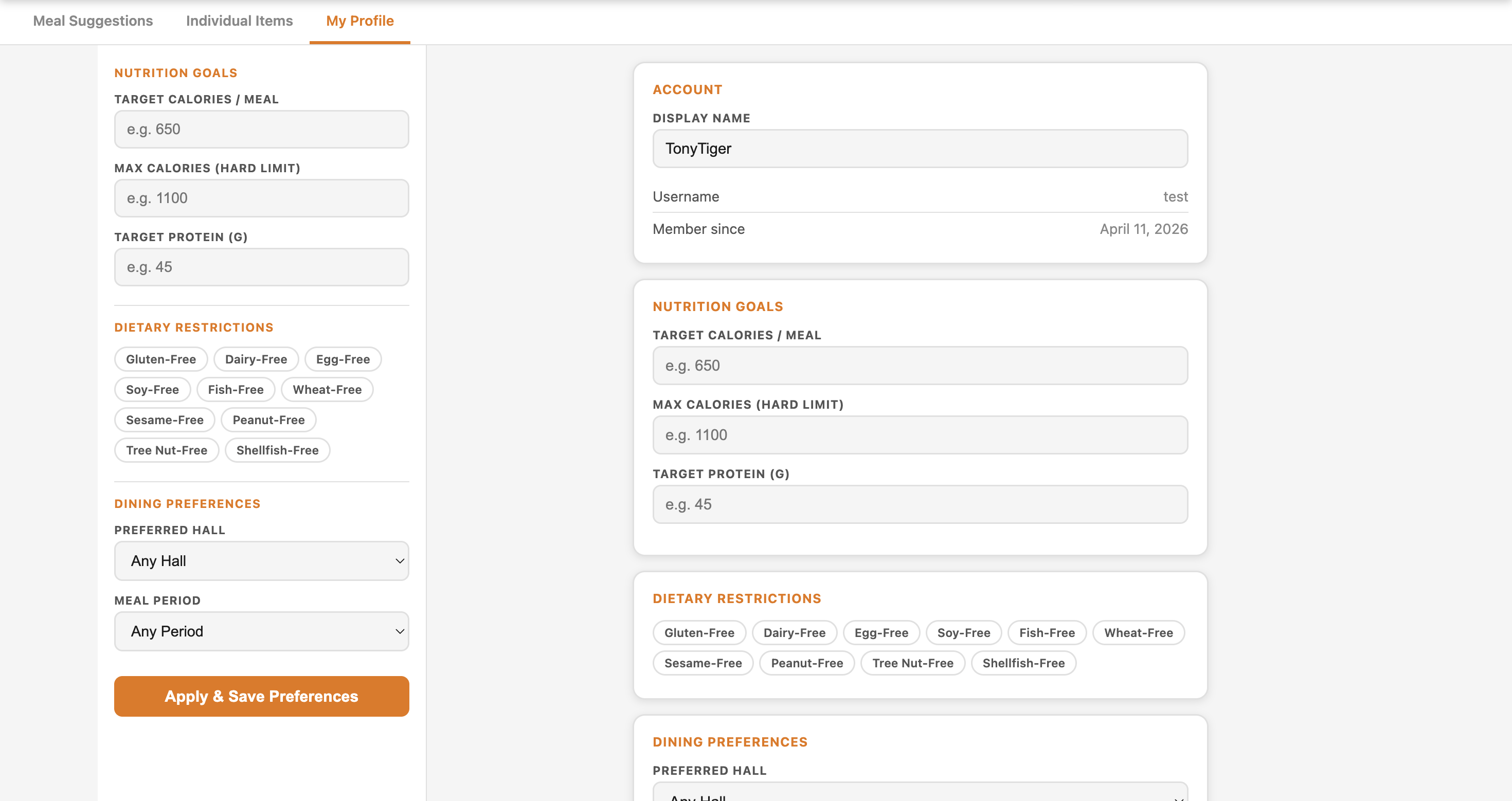 The app adjusts recommendations dynamically based on these inputs. Even without any user-defined goals, TigerBite still provides smart default recommendations along with clear nutritional justification so users understand why something is being suggested.