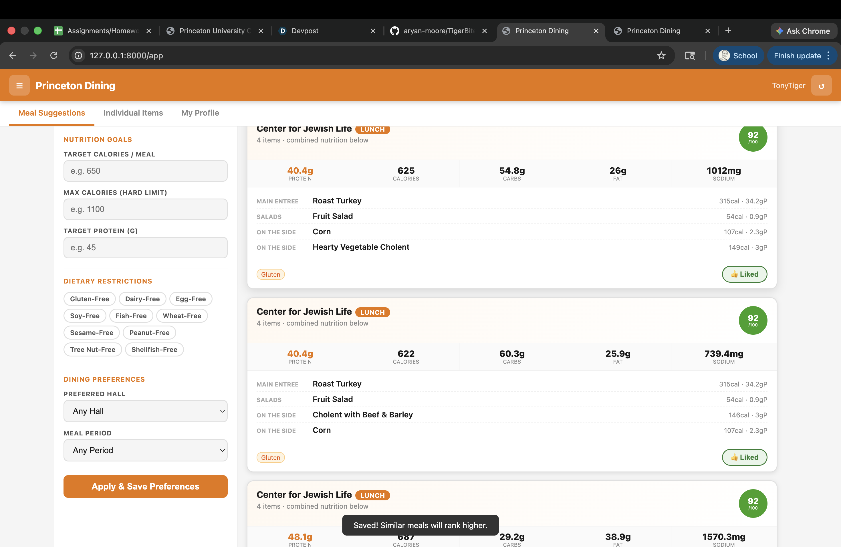 It was rough dealing with messy and inconsistent menu data from the Princeton Dining site. Items aren’t always structured cleanly, and nutrition information isn’t uniformly formatted across all dining halls.