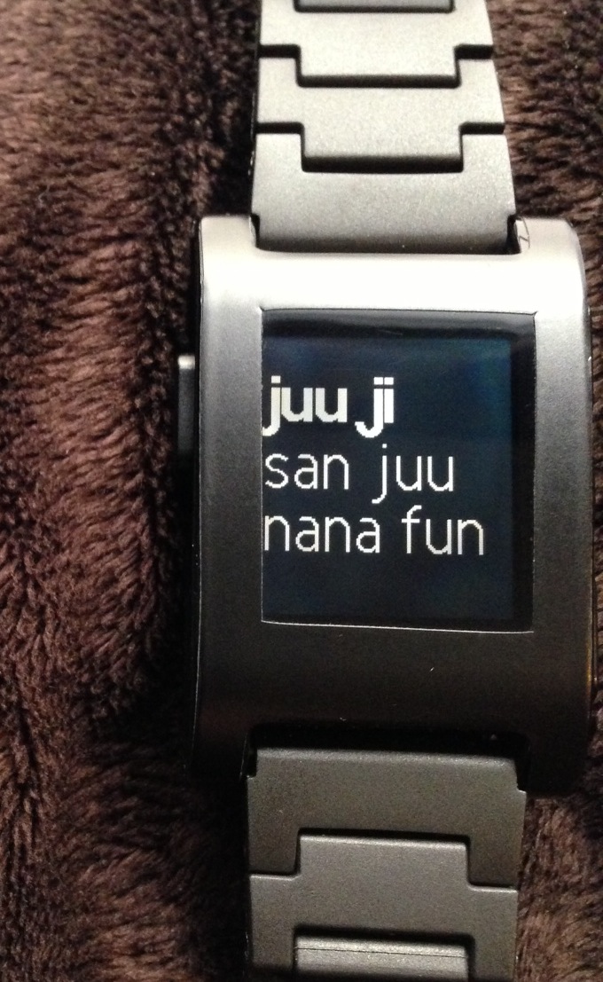 The Japanese (Romanji) version of the Pebble Text Watch project. This version shows hours (ji) and minutes (fun) in romanji text, just as you would speak it in Japanese.