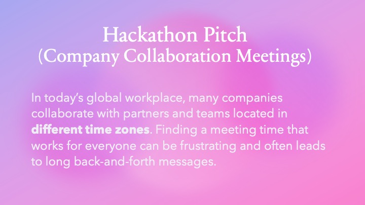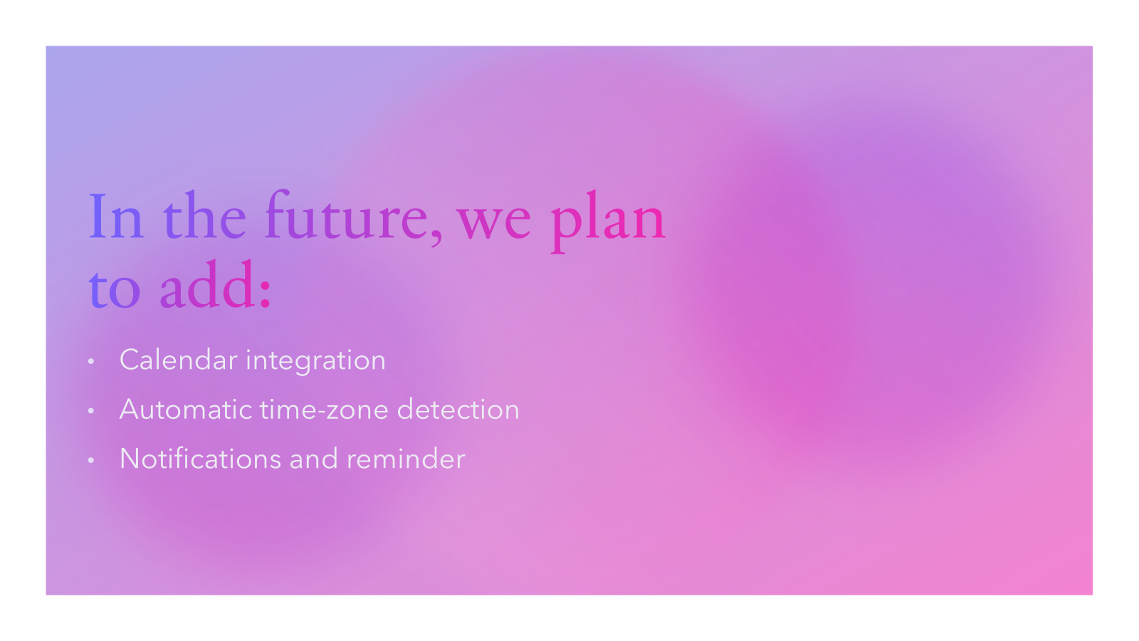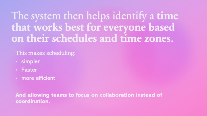 In the future, we are planning to add team and friend connections so more people can share their calendars and coordinate their time together. We also hope to expand the platform to support more time zones and make it easier for people from different regions to connect. Furthermore, Calendar integration, Automatic time-zone detection, Notifications and reminders will be considered in the detailed programming.