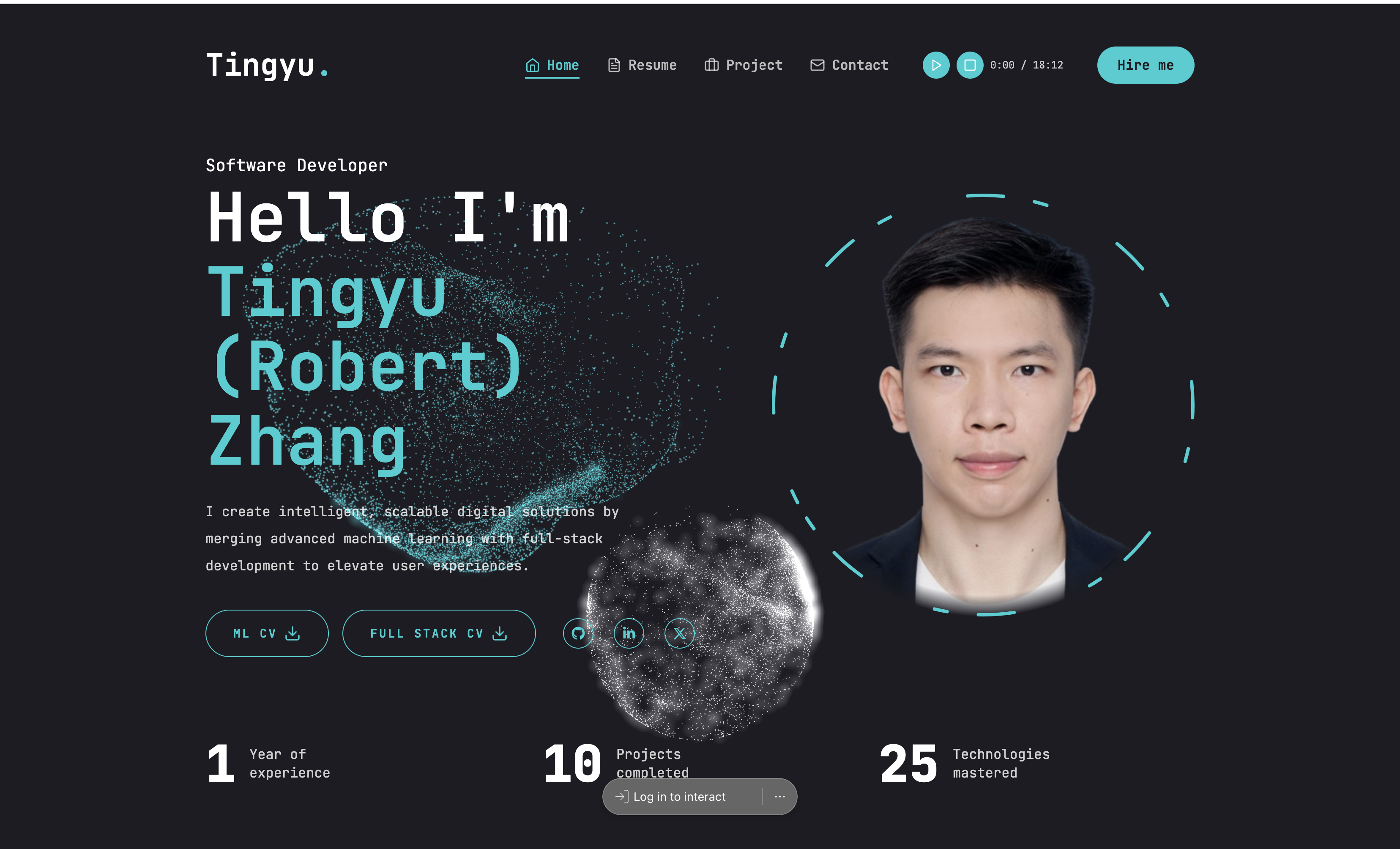 What’s next for Tingyu (Robert) Zhang’s personal portfolio • Connecting to the internet: Integrating tools like Tavily, SERP, and Perplexity to enable the avatar to retrieve real-time information. • Tool calling: Enabling the avatar to automatically schedule virtual appointments between viewers and the host. • Enhanced customization: Improving avatar features, including voice modulation, emotional expression, and visual personalization. • Real-time analytics: Implementing analytics tools like Coval to track user engagement and feedback effectively. • Reasoning models: Deploying advanced reasoning models in the background to handle complex questions seamlessly. • RL-based browsing agents: Developing reinforcement learning-based agents to provide in-depth project and repository walkthroughs, tailored for recruiters and professional reviews (e.g., Agent-S, browser-use, Claude-enhanced computing).