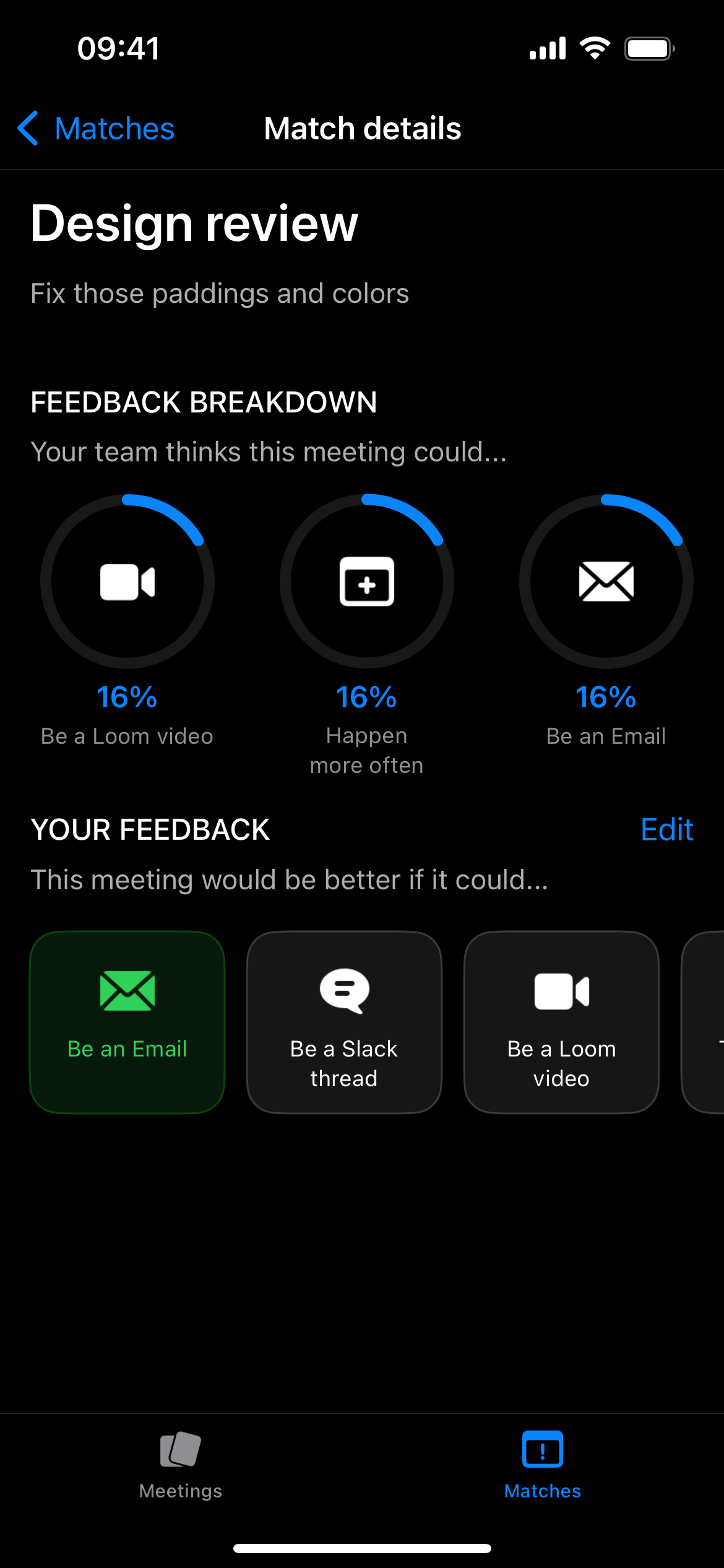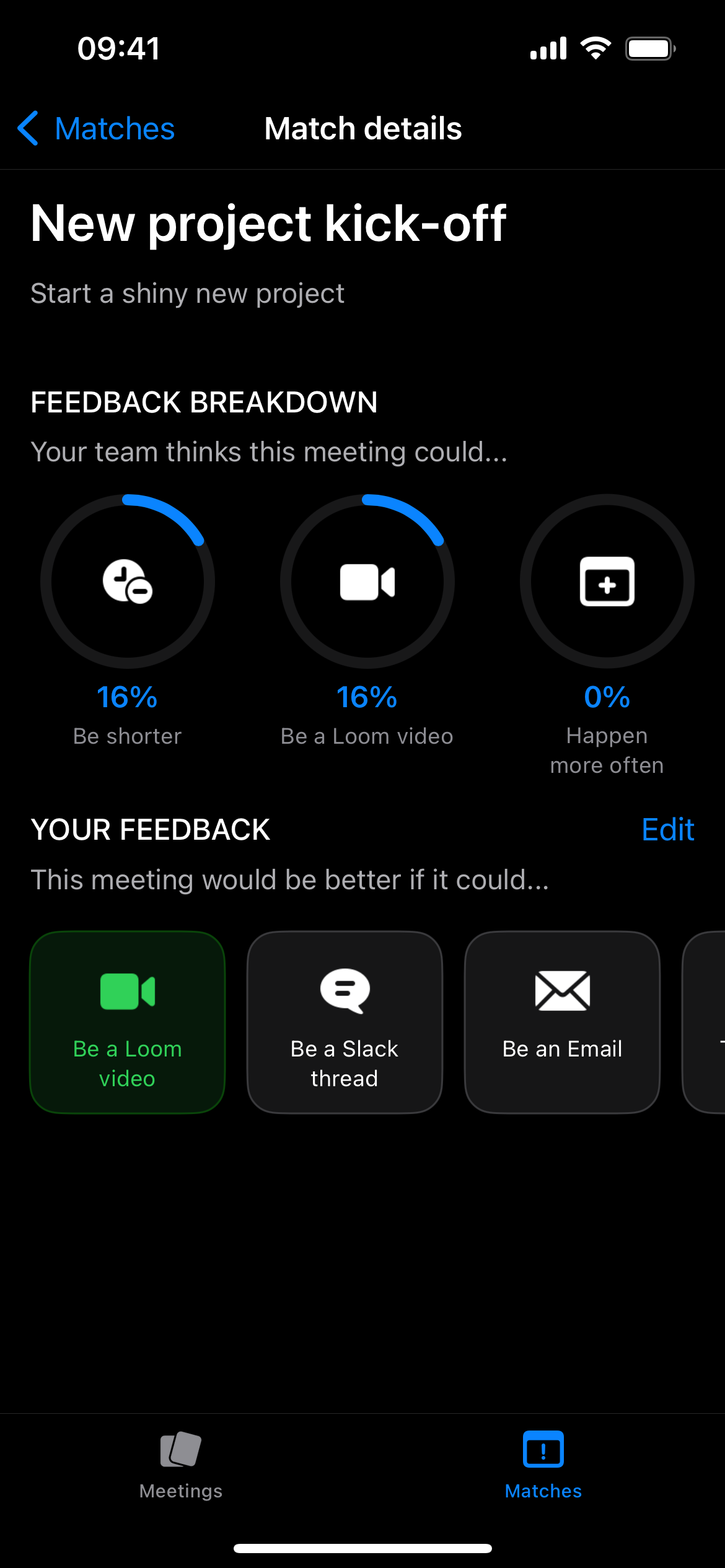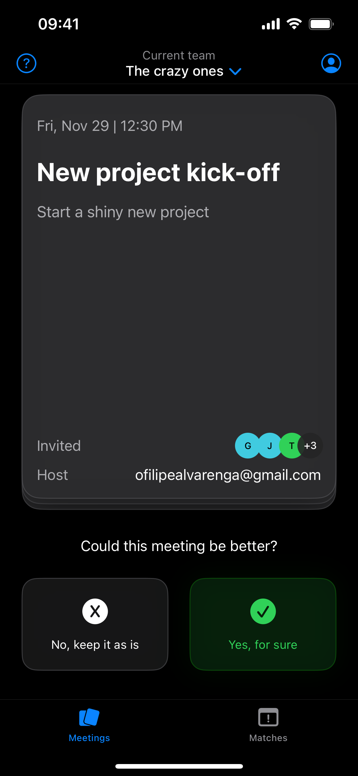 TMCBAE allows you to invite your team and connect your Google Calendars so everyone can evaluate which meetings are already effective and which could be better. If enough people vote that a meeting could be better, it turns into a match, and the team can collaborate on improving it. The outcome can be turning that meeting into a different process, such as recording a Loom and sharing with the attendees, or even canceling it.