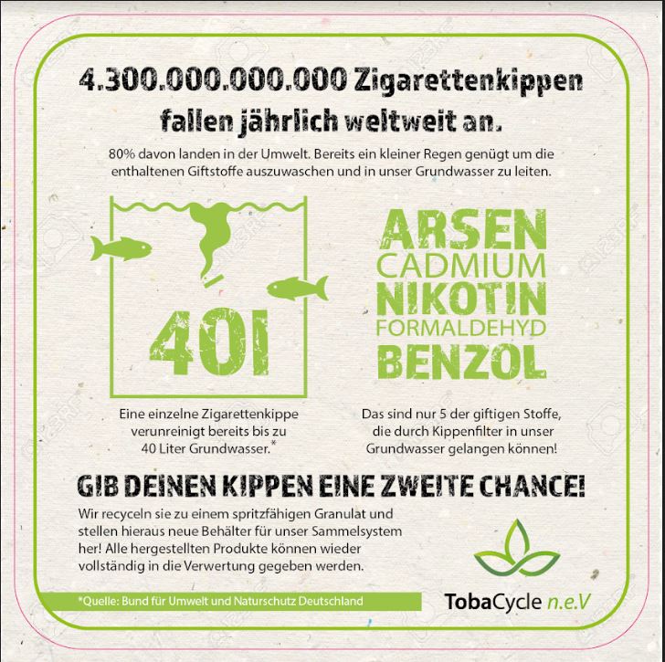 Wir behandeln Zigarettenreste als solches was Sie sind: ein Problemabfall. Zwingend notwendig ist, präventives und trockenes Auffangen. Denn Regen oder grundsätzlich Wasser spült die enthaltenen toxischen Inhaltsstoffe aus Filter und Resttabak aus. Das gilt es primär zu vermeiden, zumal der Tabak dann auch keimt und fault. Poltisch erwarten wir uns eine Nachbesserung und Aufnahme in die Kreislaufwirtschaft und Herausnahme aus dem Restmüll und der damit angeschlossenen Verbrennung.
