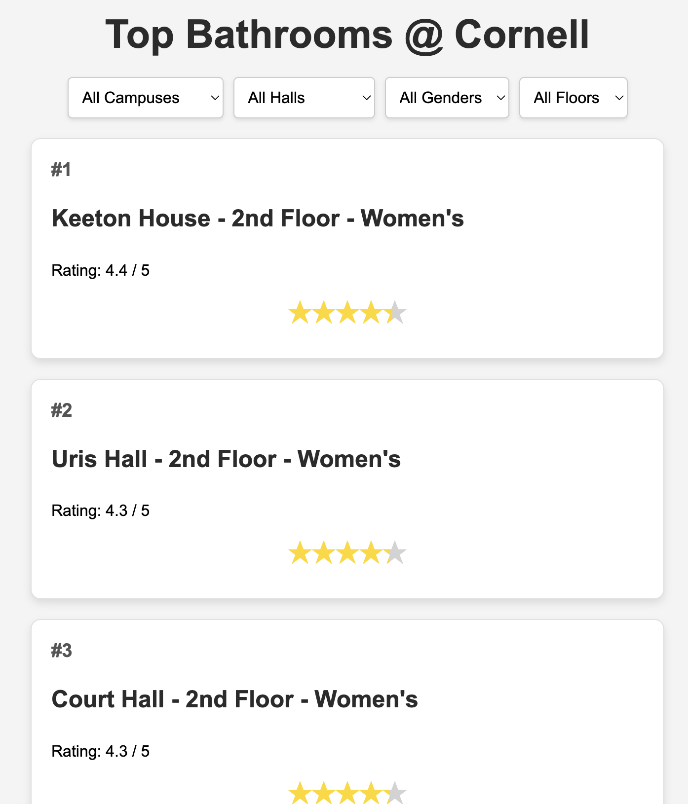 Toilets@Cornell is a web app that helps students and visitors find the best bathrooms on campus. It allows users to browse and filter bathrooms by location, gender, and floor, view ratings and reviews, and leave their own feedback. The app dynamically updates bathroom rankings based on user reviews and recalculates average ratings in real-time, providing an up-to-date guide for finding clean, accessible restrooms across Cornell's campus. With a user-friendly interface and interactive features, it serves as a practical tool for navigating campus facilities efficiently.