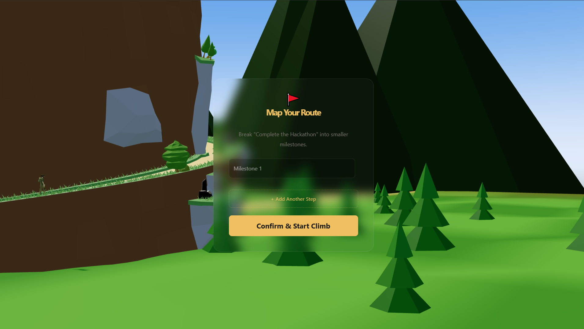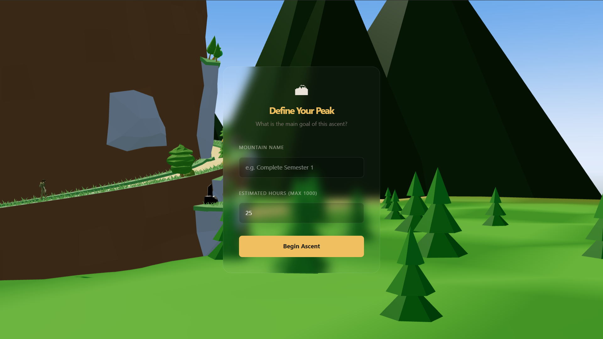 Our webpage will start with the user entering their account details or signing up with their email address and a chosen password. This will save all their goal data in their account so that they can always come back to it later. After the sign in page, they will be greeted with the image of a mountainside and their avatar ready to climb. The user will be prompted to enter a long-term goal they would like to complete along with the allocated time they think they will need to complete said goal. After this, they can also enter various milestones they think they will need to complete during the journey or leave it empty. After this, the user will start their goal, the timer will count down, and the avatar will start climbing the mountain. When the user pauses their journey manually, to rest or has been detected by the computer vision as being away from their computer or distracted, the timer will pause and their avatar will stop in the middle of their climb. The computer vision system runs constantly in the background that monitors your behaviour through the computer camera. It detects if you are still in frame and if you are distracted with your eye movements and your hand position. For example, if you are using your phone while the timer is running, the computer vision will automatically pause the timer for you to ensure no time is recorded on unproductive actions. Likewise, if you are away from your desk to rest, the timer will similarly pause and unpause when the user is back in frame of the computer vision. This allows for more convenient use of the program and thus less distractions. The subgoals the user has entered will appear on the side of the screen as checkboxes. If the user has achieved one while the main goal is still in progress, they can tick off the boxes to mark it as complete, and a flag will be planted at the location of their task completion. If no milestone was entered, the main goal: reach the summit, will be the only one available. The user finishes their climb when all checkboxes on the right side have been checked, or if the timer runs out. The user will be congratulated with fireworks at the summit and will be prompted to create a new main goal if they wish.