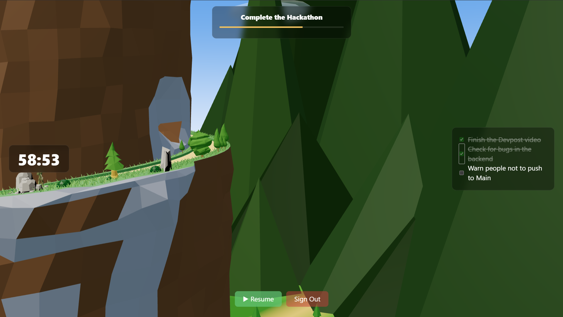Feature features can include more weather effects such as heavy rain if the computer vision detects distractions from the user, changing mountain scenery (eg. Jungle to Taiga) according to timer thresholds, more statistics displays such as total time spent productively in submenus, and improved low poly graphics and total rendering image. We also plan for our webpage to track multiple main goals as multiple mountains to climb, which is stored in profile form in each user's personal accounts. Each goal/mountain starts with the user specifying an amount of time they think it would take to achieve it and entered into the webpage. Then, they will enter various subgoals that can be completed during the main goal, and the corresponding time allocated for them. A Chrome extension will also be added to monitor browser tabs to ensure that users remain focused on their work rather than mindlessly scrolling. Multiplayer with multiple people completing the same goal is also planned, where users can pass their friends on the mountain path during their climb to see other people’s progress.