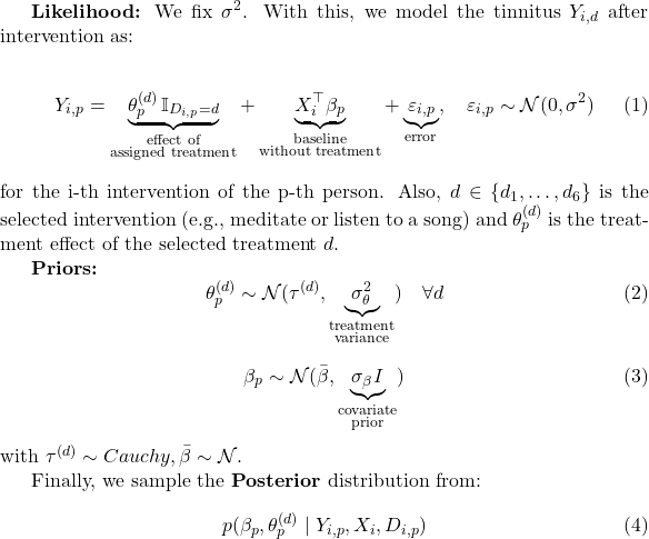 We developed an intuitive, easy-to-use application accessible easily to all generations, including elderly people who are the demographic most affected by tinnitus. The interface prompts the user with an initial questionaire with questions about their current situation. We use React-Native with Typescript for the frontend, and Python combined with our Bayesian adaptive learning algorithm implemented with PyStan on the backend.