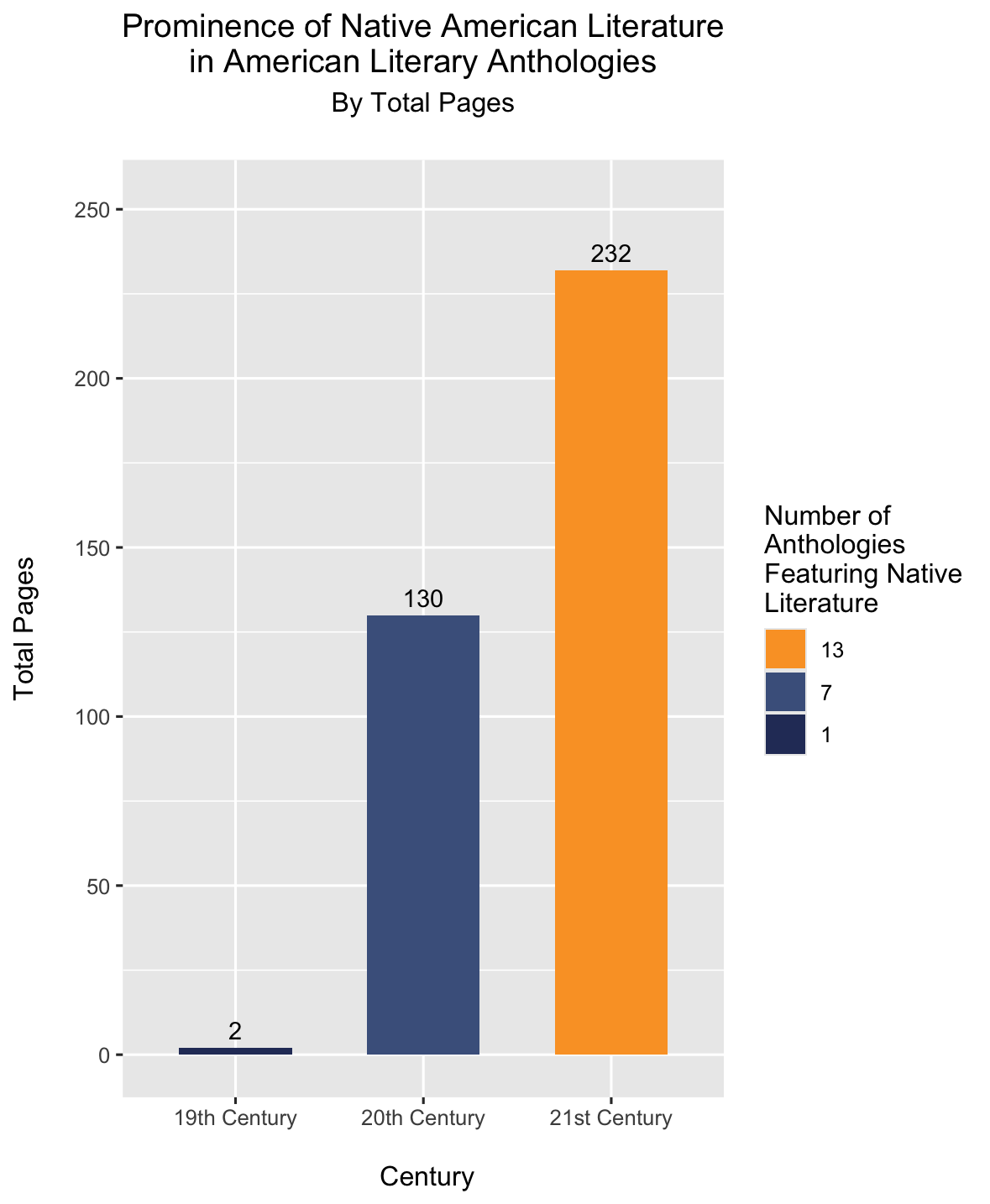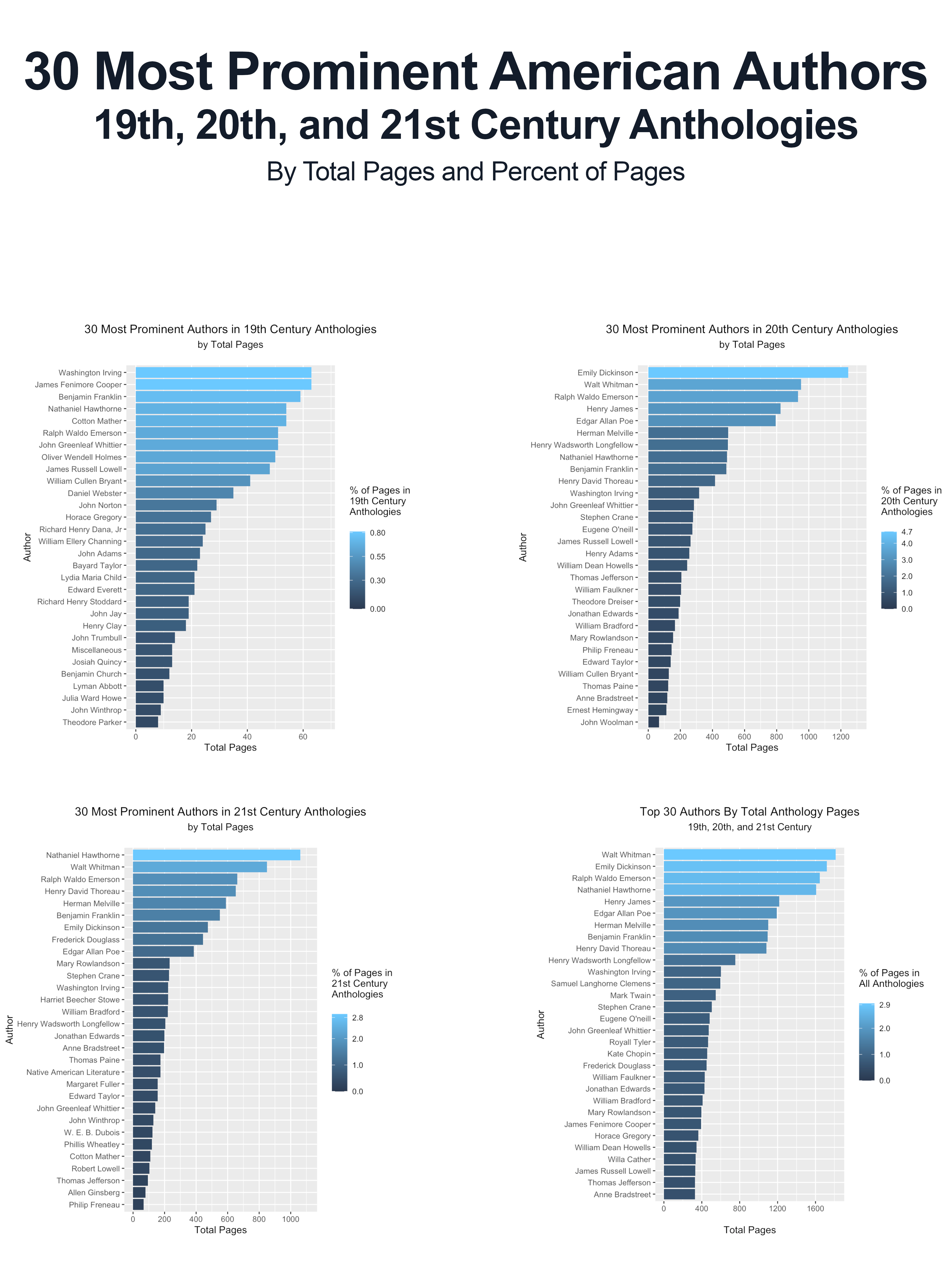 From tables of contents of American literary anthologies, we were able to understand who are considered ‘major’ American authors, using page counts and relative percentage of total pages. Furthermore, we compared the actual number of anthologies authors were featured in to see prominence. We learned that poets like Emily Dickenson and Walt Whitman were featured the most overall, with high page counts and number of occurrences. Interestingly, while we found that Native American Literature was moderately to frequently included in Literary Anthologies, the amount of pages it received was very small compared to other authors occurring just as frequently. This shows what authors of these anthologies consider "major" and "prominent" in the history of American Literature.