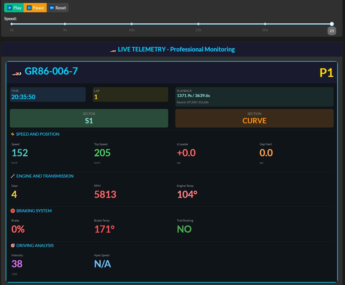 - Playback Simulation: Replay races at 1x-25x speed with complete control