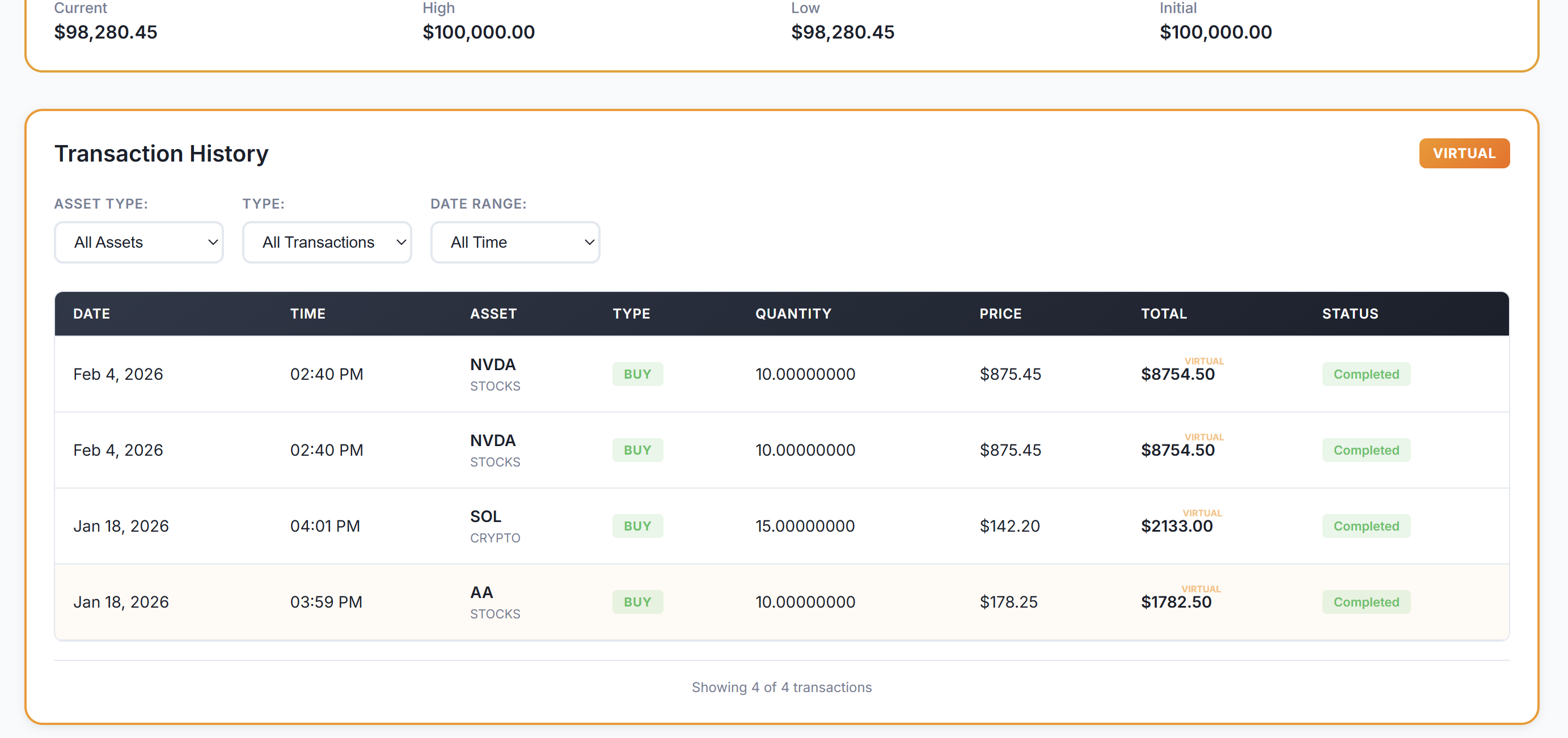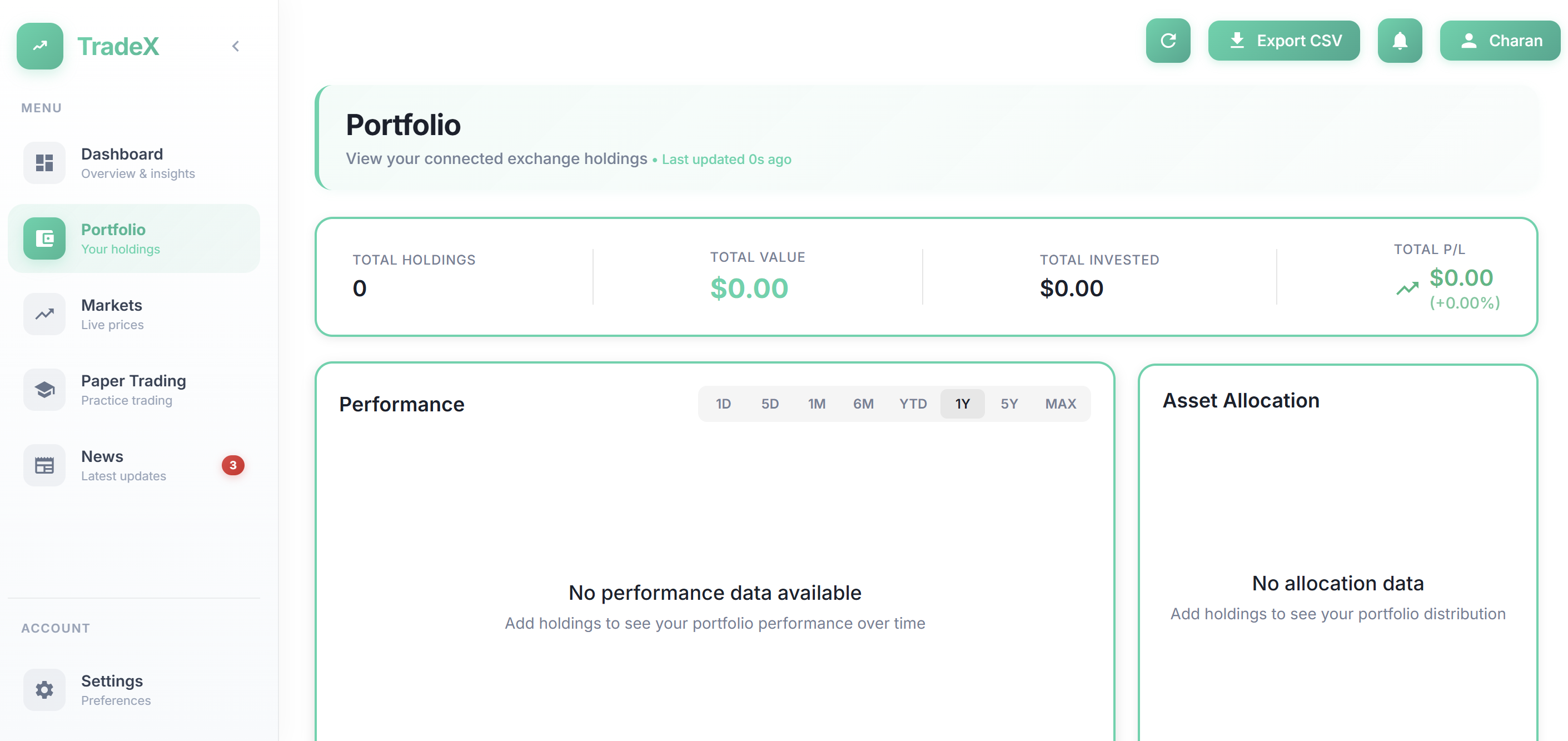 - Paper trading engine — practice with $100,000 virtual balance at live market prices