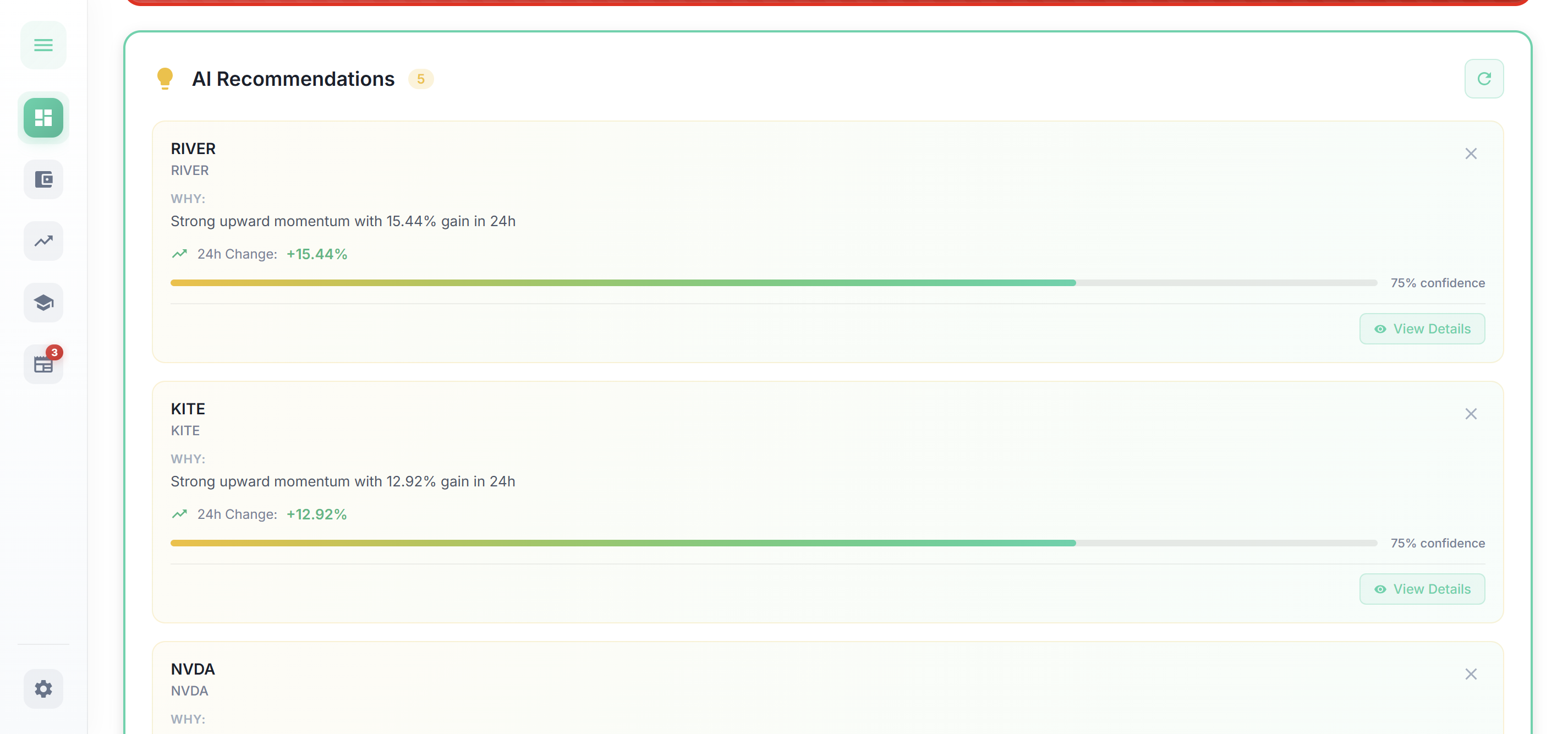 - AI-powered trading signals using Google Gemini Flash — with BUY/SELL/HOLD recommendations, confidence scores, price targets, and plain-English explanations