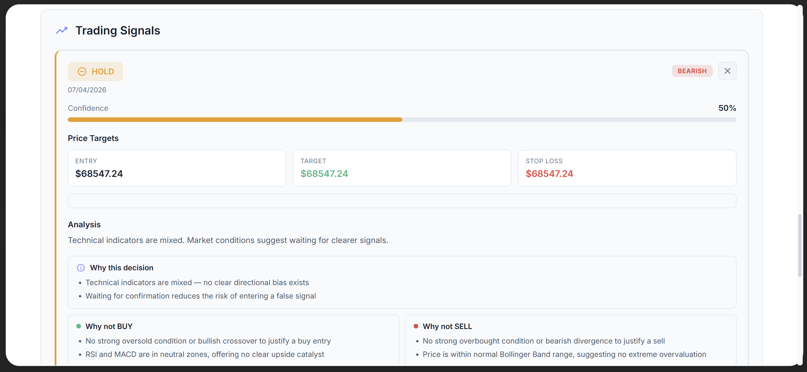 AI: Google Gemini Flash 1.5 analyzes technical indicators (RSI, MACD, Bollinger Bands, EMA, SMA) and returns structured trading signals with full explainability. Rule-based analysis acts as fallback when Gemini is unavailable.