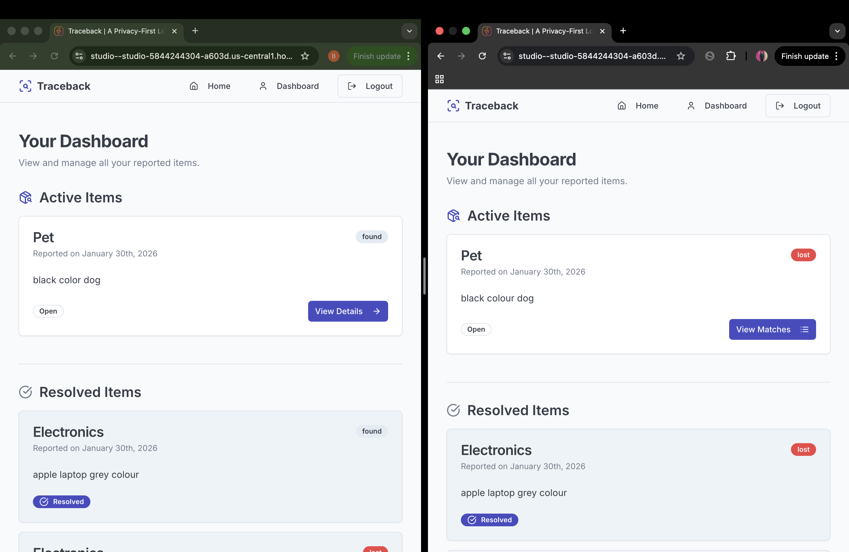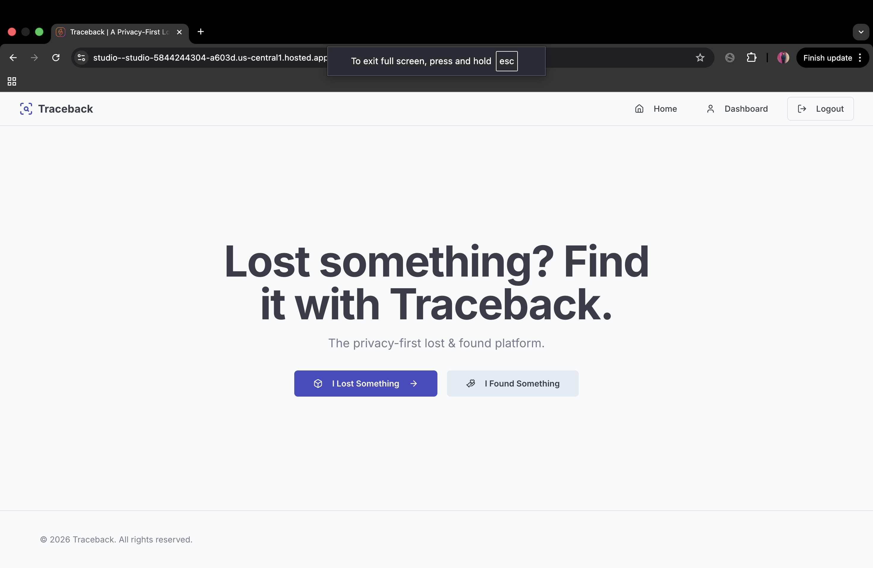I built TraceBack as a full-stack web application using Firebase for authentication, database, and hosting. AI capabilities are integrated to assist with intelligent matching and analysis. The platform follows a privacy-first design and structured workflows.