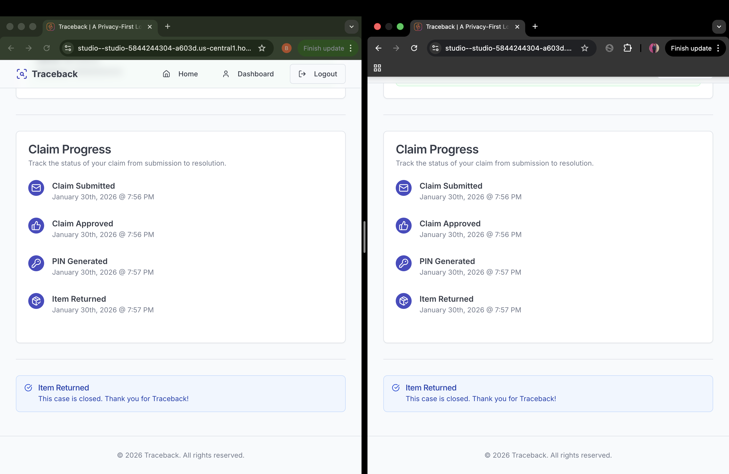 Losing personal belongings is a common real-world problem, but recovering them is often unstructured, insecure, and stressful. Most existing solutions rely on informal communication, lack privacy, and provide no clear verification during handover. TraceBack was built to explore how a structured, secure workflow could improve the lost-and-found process.