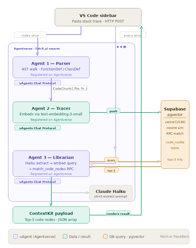 TraceBack was built on top of the VS Code Extension API, with the frontend rendered with React.js inside a VS Code Webview. In the background, Fetch.ai uagents hosted on Agentverse use an Abstract Syntax Tree to break down the codebase, then parse the output to generate vector embeddings, which are pushed to Supabase (pgvectors) and extracted using a cosine similarity search to source the failing function.