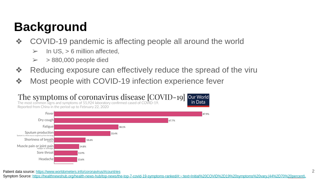 The SARS-CoV-2 pandemic has touched millions of lives across the world. In the U.S., more than 6 million people have been infected and at least 880,000 people have lost their lives to this brutal respiratory disease. People with SARS-CoV-2 infection experience a wide range of symptoms with common ones such as fever, dry cough and fatigue. Despite the fact that some people may be asymptomatic and still able to carry the virus and infect others, body temperature monitoring is still an easy and straightforward way to detect signs of infection.