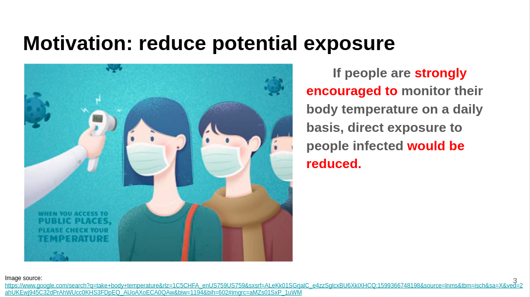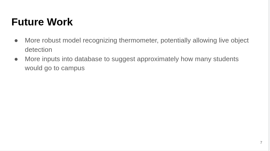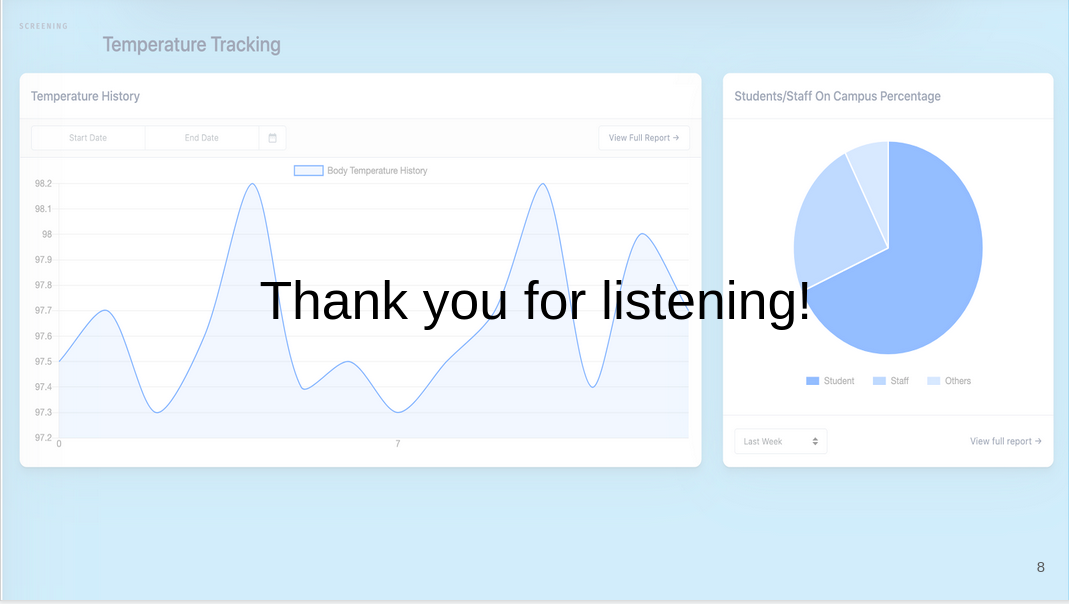 In the future, we envision to improve the robustness of the model to accurately recognize the presence of thermometer in the photos, or adding live object detection to further ensure that students are actually taking their temperature. At the same time, we would like to include more features in the web application to enforce proper social distancing. For example, the application may ask student users to estimate their approximate time of arrival and departure at the school so that the school can estimate how many students are present on campus at one particular time. Meanwhile, we will do our best to protect individuals privacy over health conditions and daily activities.