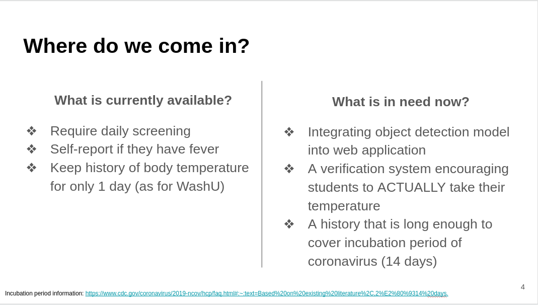 We as engineers propose a web-based application for self-reporting purpose. For the prototype, we chose to focus on college students who are returning to campus for in-person classes. The students will log into the system with their personalized usernames and passwords, asked to report whether they have symptoms such as fever, cough etc, and upload a photo of them taking temperatures. The photo will be fed into an object detection algorithm in order to verify the presence of a thermometer and the temperature readings in the photo. Users will also have access to a dashboard that displays a history of body temperature and whether they have passed the daily screening.