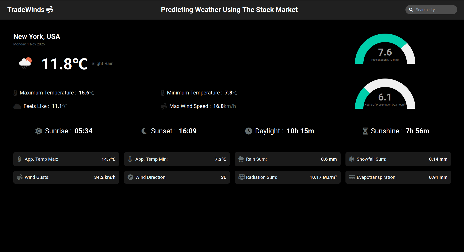 We used open-meteo and y-finance to pull historical weather and stock data. Then using scikit-learn we built a simple neural network that predicts multiple weather statistics using the stock data of the last 7 days. Then we built a website using vanilla HTML, CSS and JavaScript