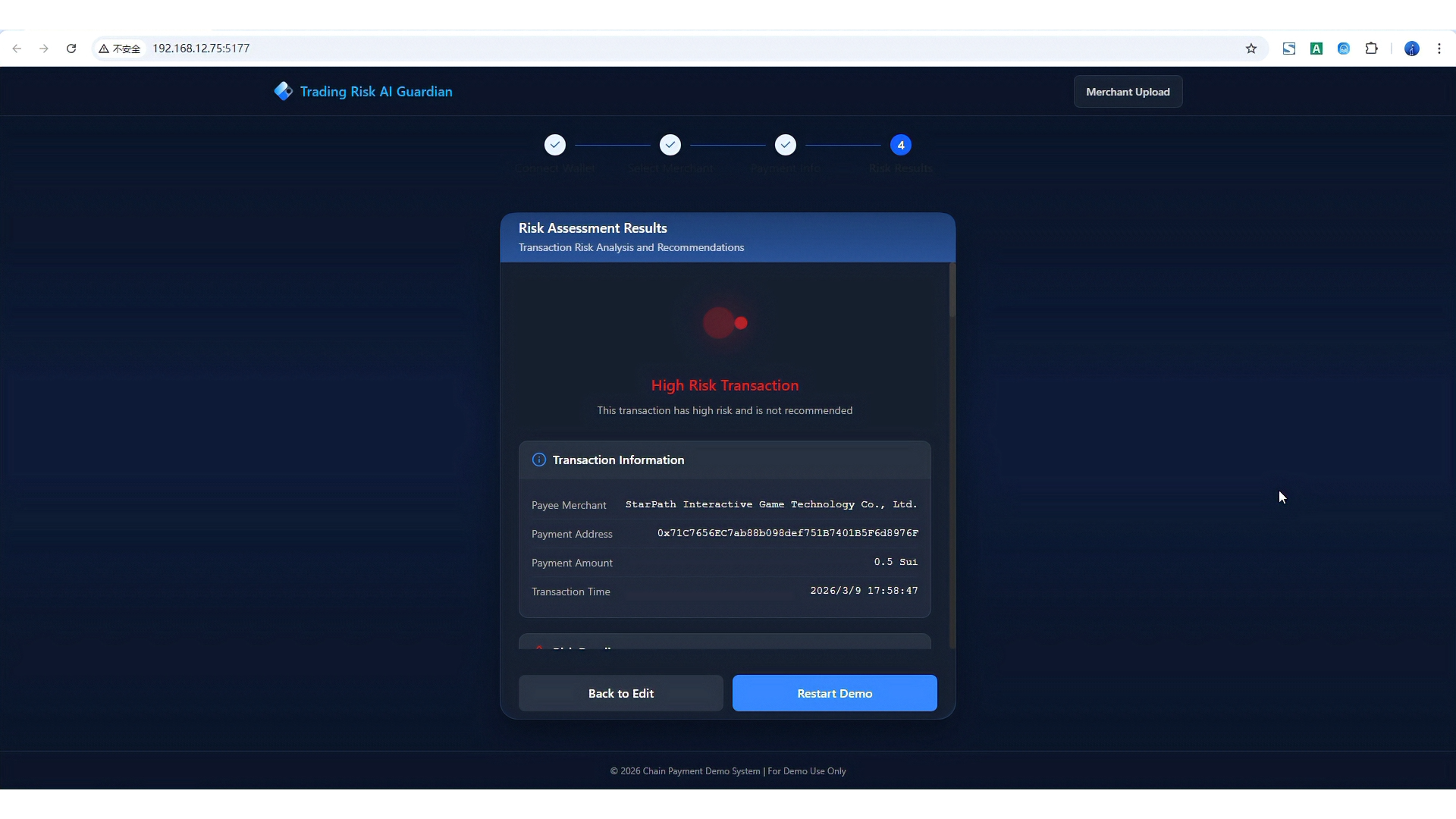 - Smart Contracts (Sui Move): Handle merchant registration, transaction requests, risk result recording, and appeal processes.
