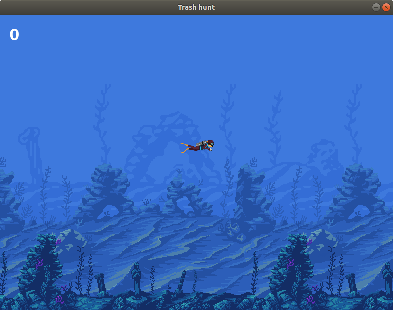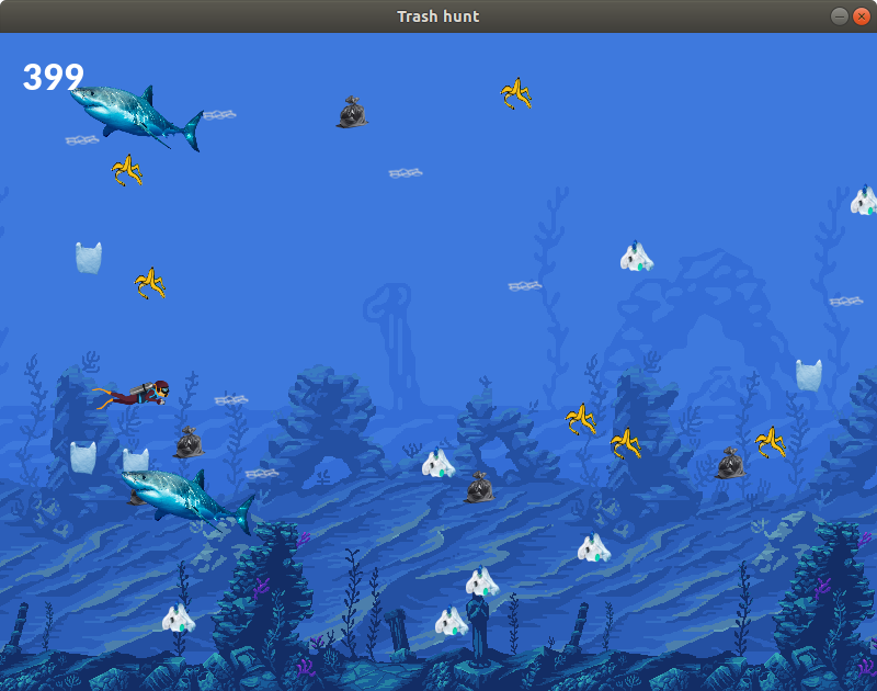 Its a simple game, where player cleans ocean by collecting trash and dodging sharks. The speed and frequency of the sharks keep increasing as the player score increases.
