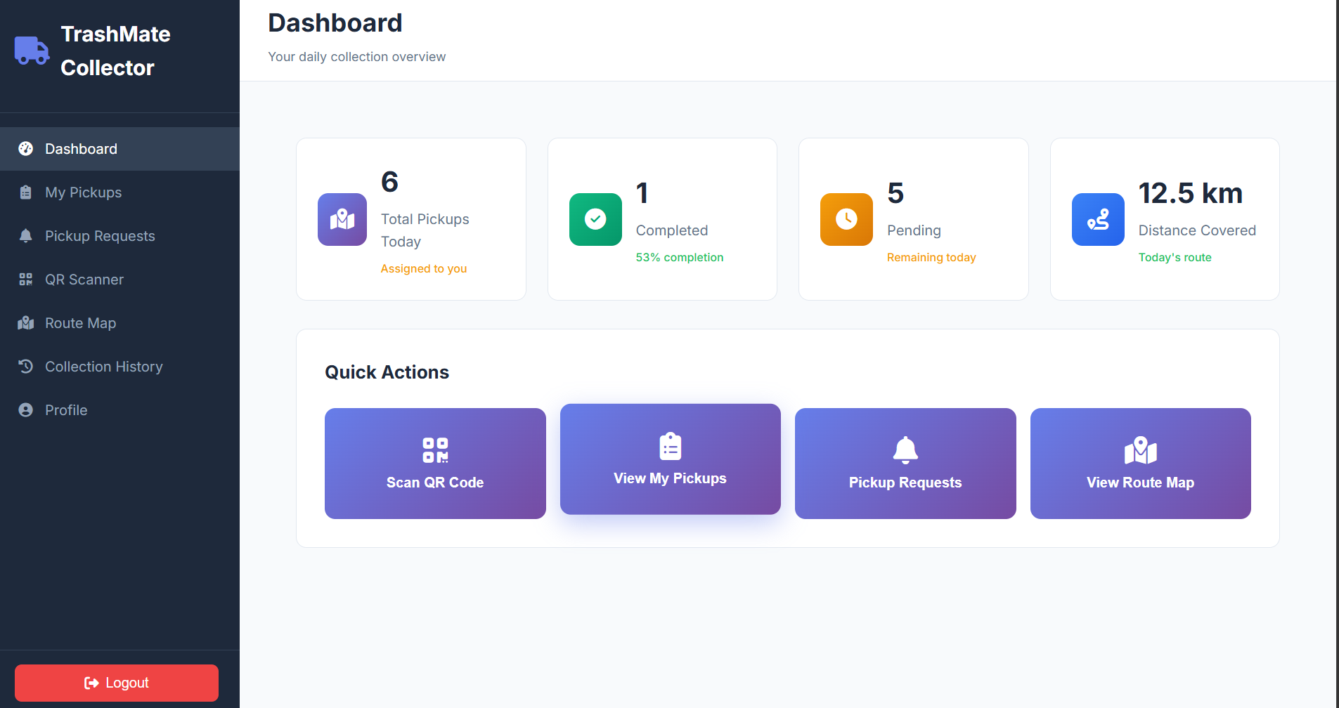 Modules implemented: User login and authentication Waste pickup request system Nearby waste centers Collector task management QR code verification system