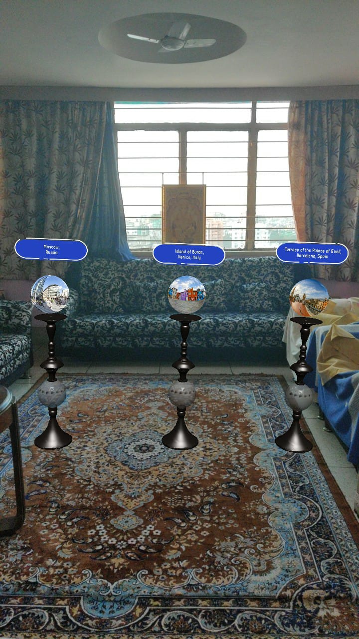 The filter provides you options(labelled spheres) on various stands in the camera view. When you click on any option it ports you to the labelled place, where you can experience the Panoramic view of the tourist spot. To come back to your camera view, tap anywhere on the screen.