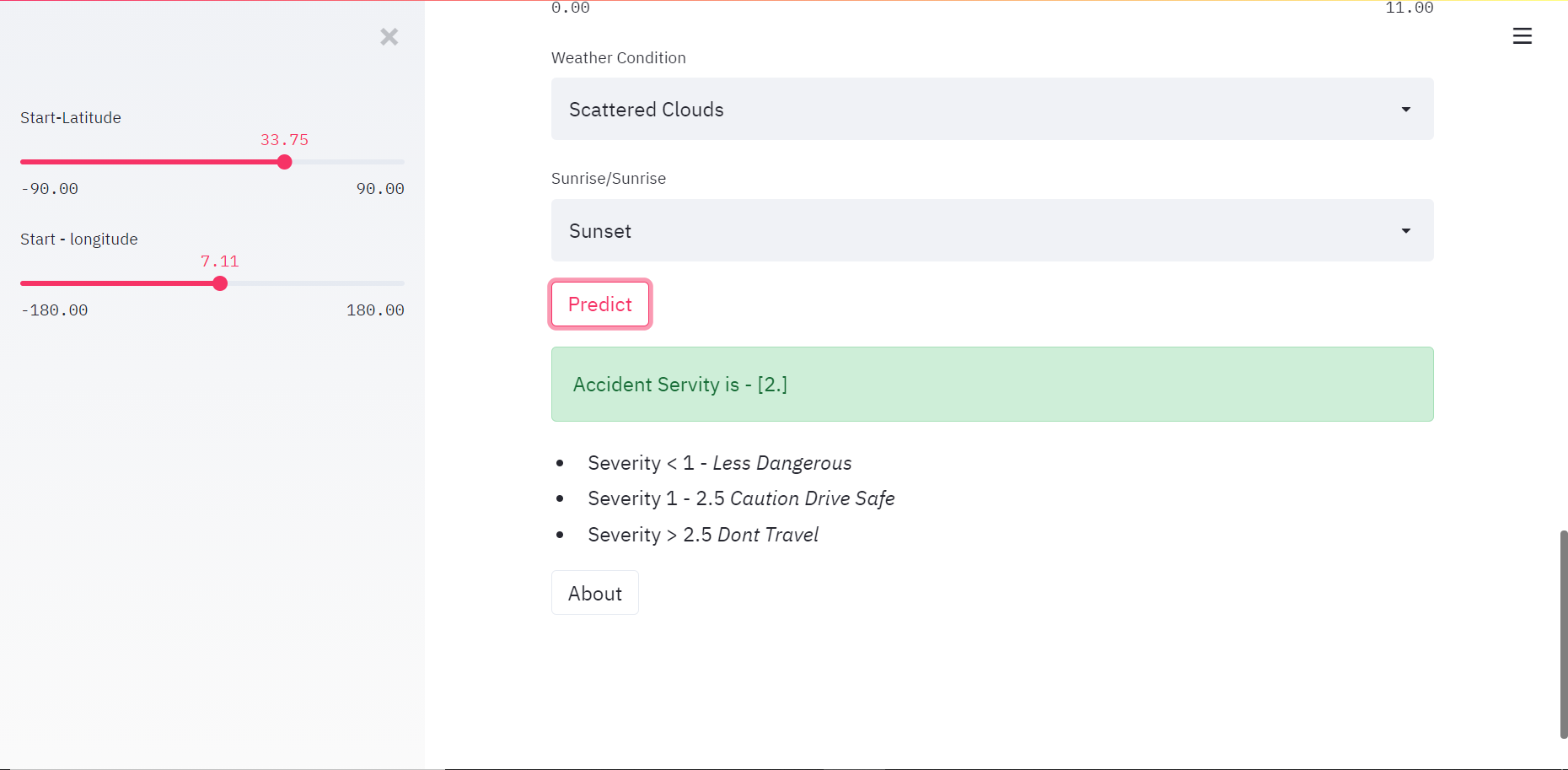 Our objective is to reduce the number of road accidents and their severity by predicting severity of accidents in areas taking into account numerous surrounding factors and alerting the driver to be careful in case of the former being true.